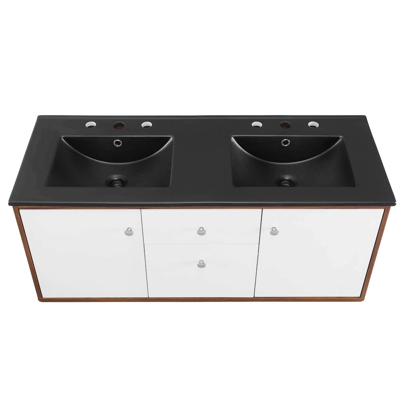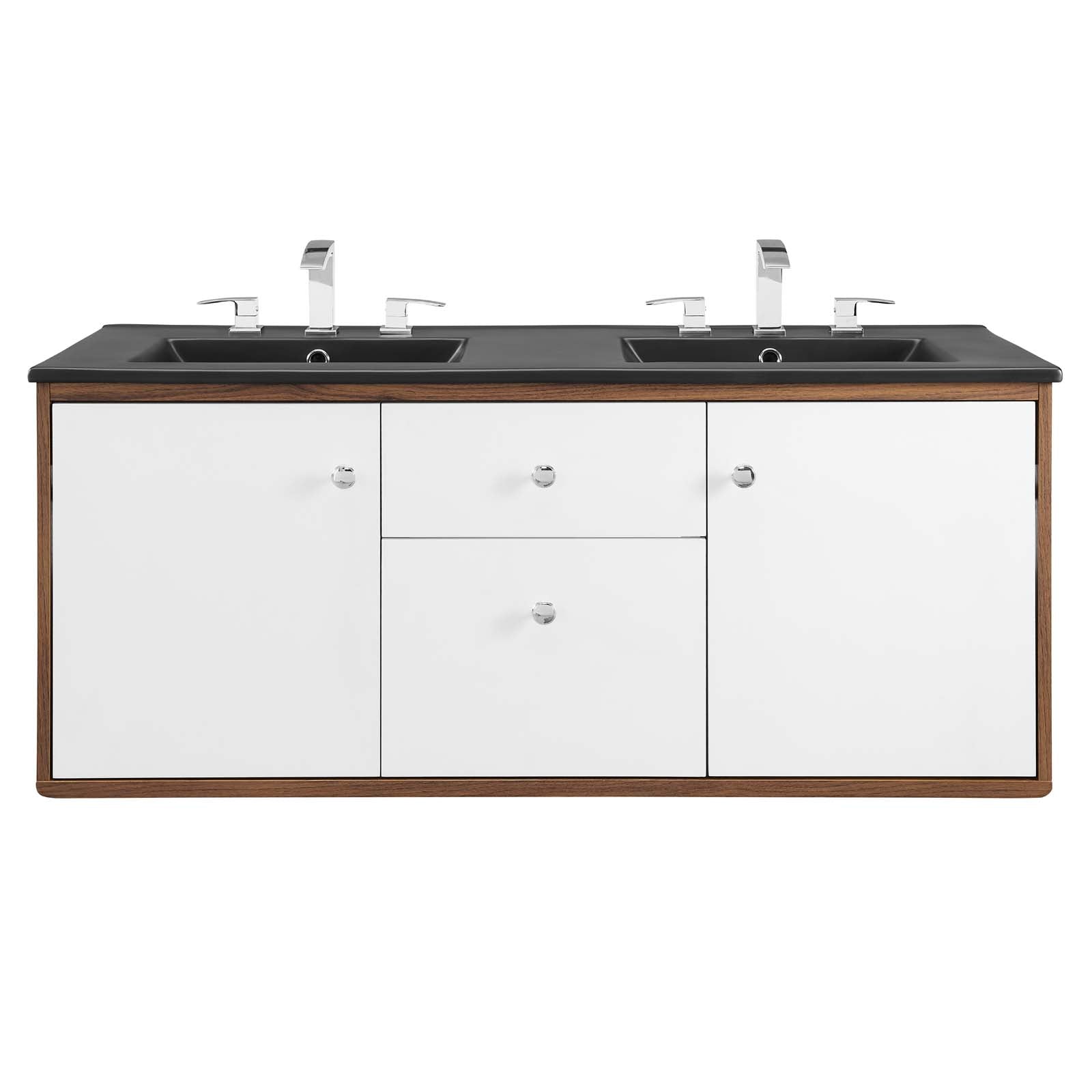 Bring mid-century modern aesthetics into the bathroom with the Transmit 48" Bathroom Vanity. This vanity features a durable particleboard and walnut grain veneer construction with ample storage space for all your bathroom essentials behind two white lacquered soft-close hinged doors and in a spacious center drawer. A ceramic double sink with an integrated countertop, 8" centerset faucet holes, and rectangular sink basin continues the sleek look of this retro modern vanity. Complete with chrome knobs and a fixed drawer, this bathroom vanity mounts directly to the wall saving a substantial amount of floor space. Assembly required and sink fixtures not included.