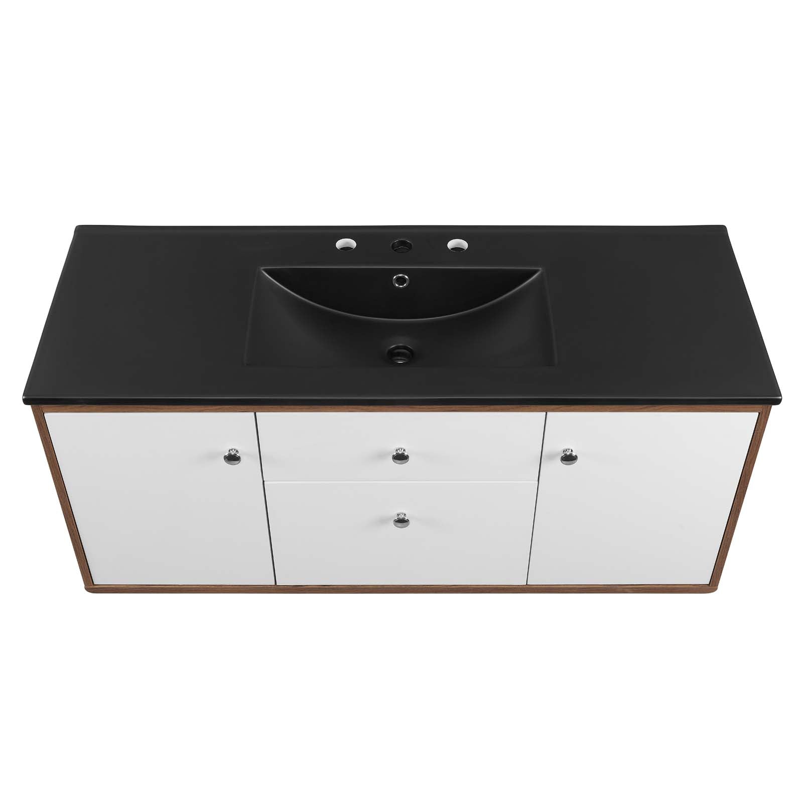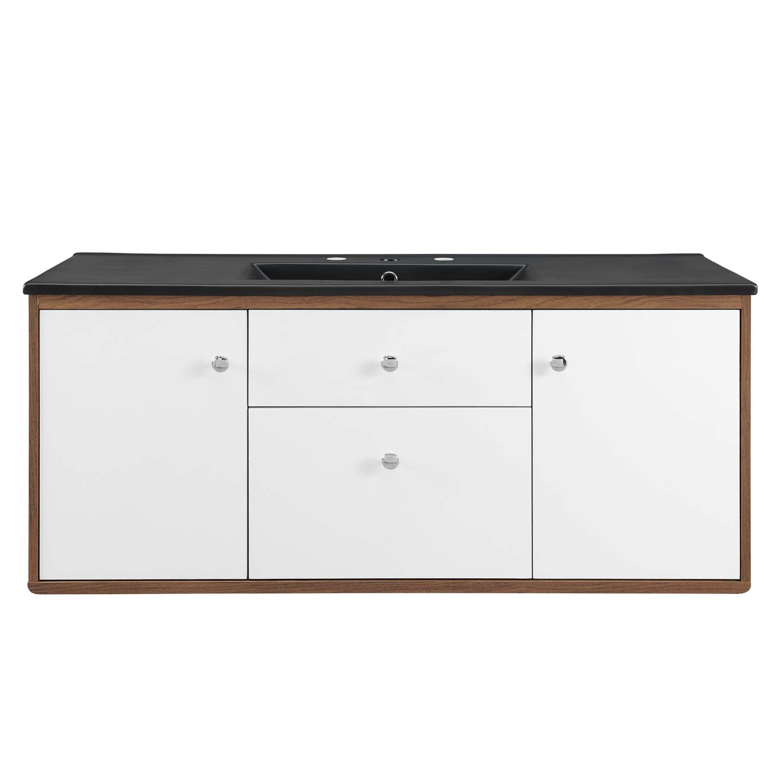Bring mid-century modern aesthetics into the bathroom with the Transmit 48" Bathroom Vanity. This vanity features a durable particleboard and walnut grain veneer construction with ample storage space for all your bathroom essentials behind two white lacquered soft-close hinged doors and in a spacious center drawer. A ceramic sink with an integrated countertop, 8" centerset faucet holes, and rectangular sink basin continues the sleek look of this retro modern vanity. Complete with chrome knobs and a fixed drawer, this bathroom vanity mounts directly to the wall saving a substantial amount of floor space. Assembly required and sink fixtures not included.