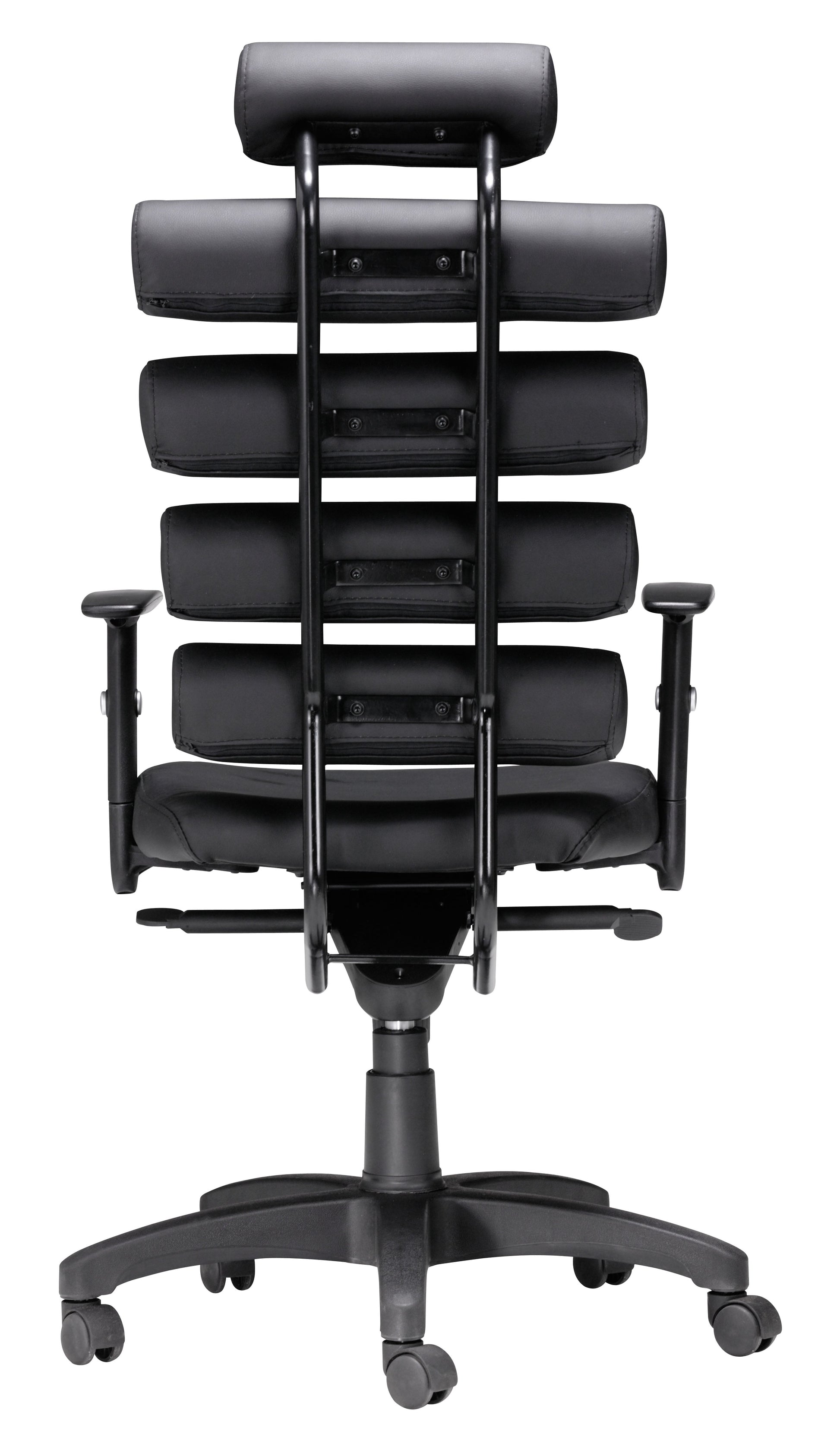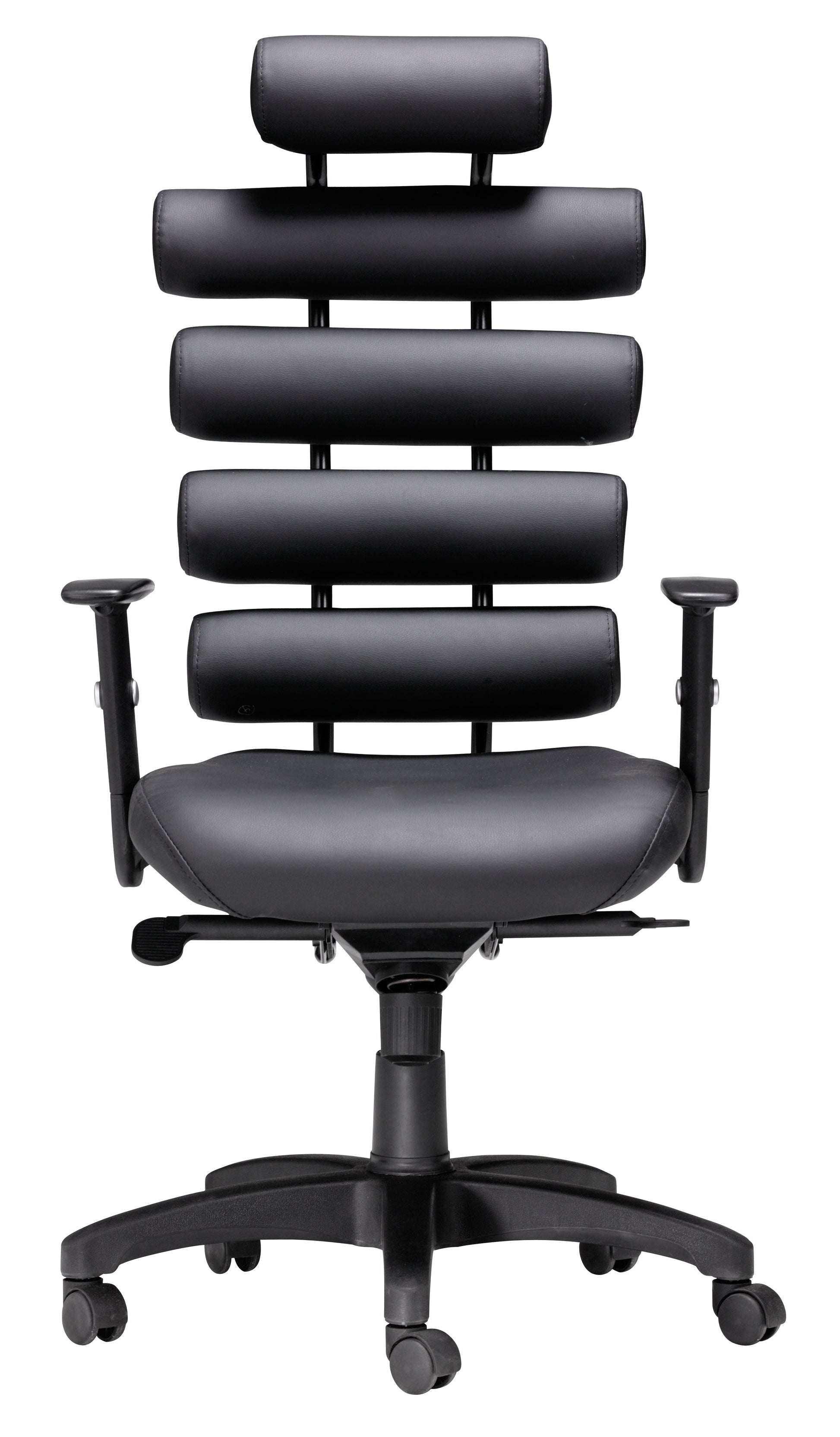 This high back office chair provides ultimate lumbar support. The Unico has firm 100% Polyurethane cushion rolls for the back and a plush seat. The frame is comprised of a steel tube and the arms are height adjustable. The tilt mechanism is locking and height adjustable.