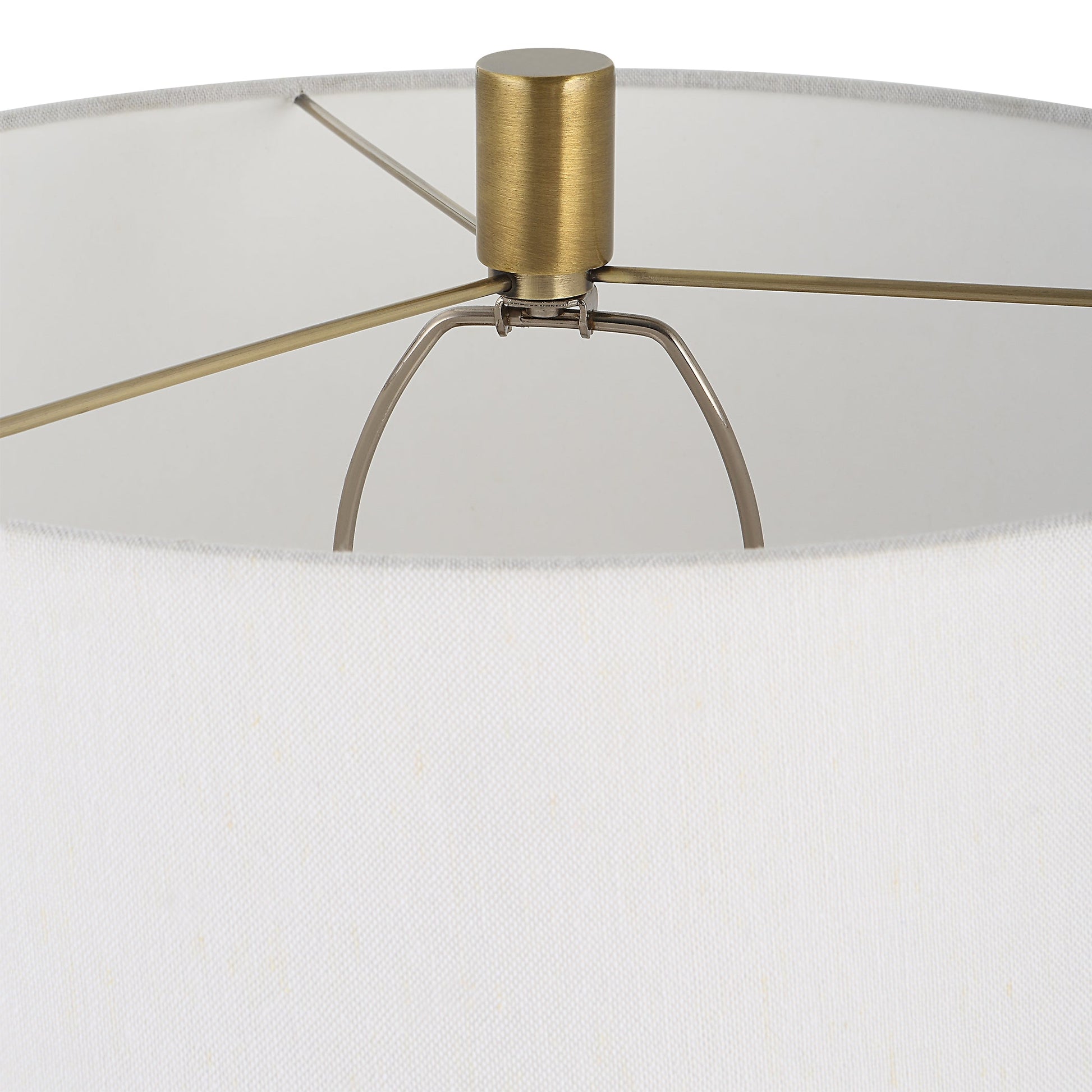 Sophisticated And Versatile, This Table Lamp Displays A Solid Iron Base Finished In Warm Brushed Brass With An Ivory Crackle Glazed Ceramic Center. The Hardback Drum Shade Is Covered In A White Cotton Fabric. Overall Depth : 17 in Overall Width : 17 in Overall Height : 30.5 in