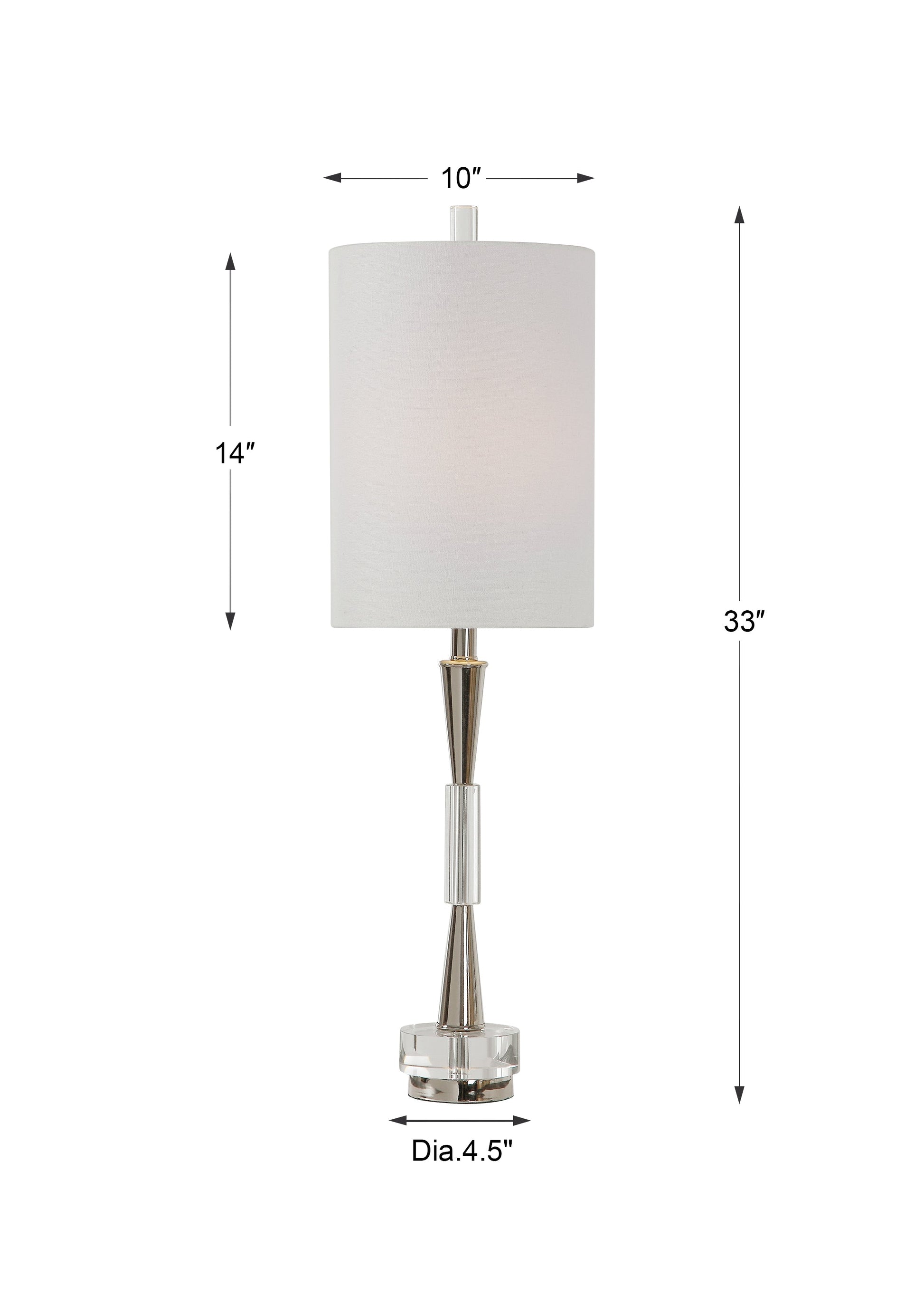 This Clean And Contemporary Buffet Design Has An Alternating Polished Nickel And Crystal Base That Exudes Modern Elegance. The Round Hardback Shade Is A White Linen Fabric. Overall Depth : 10 in Overall Width : 10 in Overall Height : 33 in