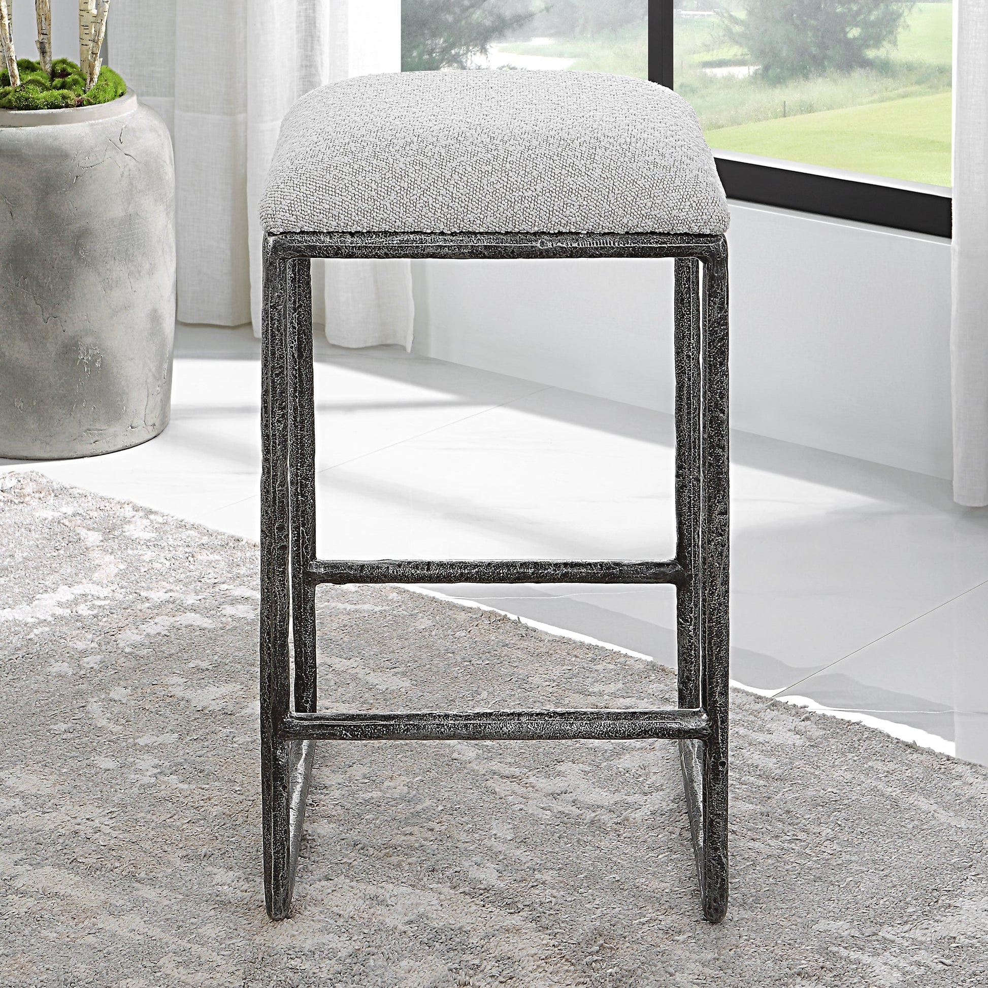 With Clean Contemporary Lines, This Open Frame Design Features A Textured Cast Iron Base In A Natural Distressed Charcoal Finish. Paired With A Tight Upholstered Seat In A Casual Ivory And Warm Gray Boucle Fabric. Seat Height Is 26". Overall Depth : 15 in Overall Width : 15 in Overall Height : 26 in