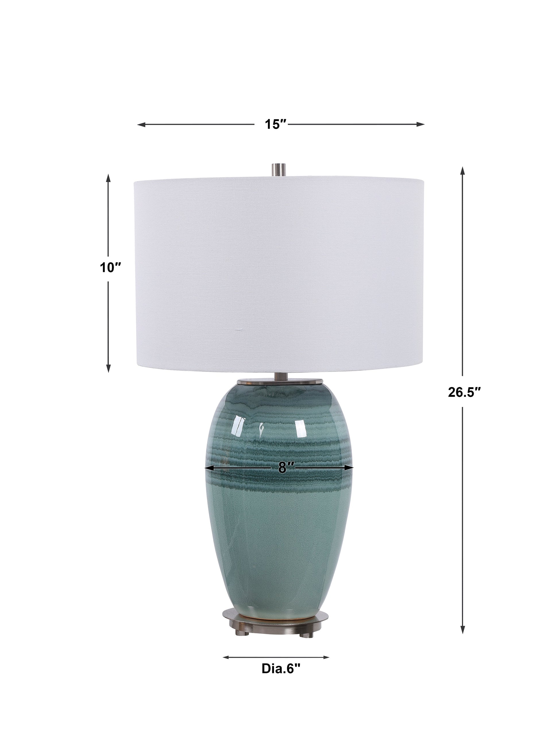 This Ceramic Table Lamp Is Finished In A Beautiful Aqua And Teal Crackle Glaze Paired With Brushed Nickel Plated Accents That Add An Elegant Touch To The Piece. The Lamp Is Complemented By A White Linen Fabric Drum Shade. Overall Depth : 16 in Overall Width : 16 in Overall Height : 25.5 in