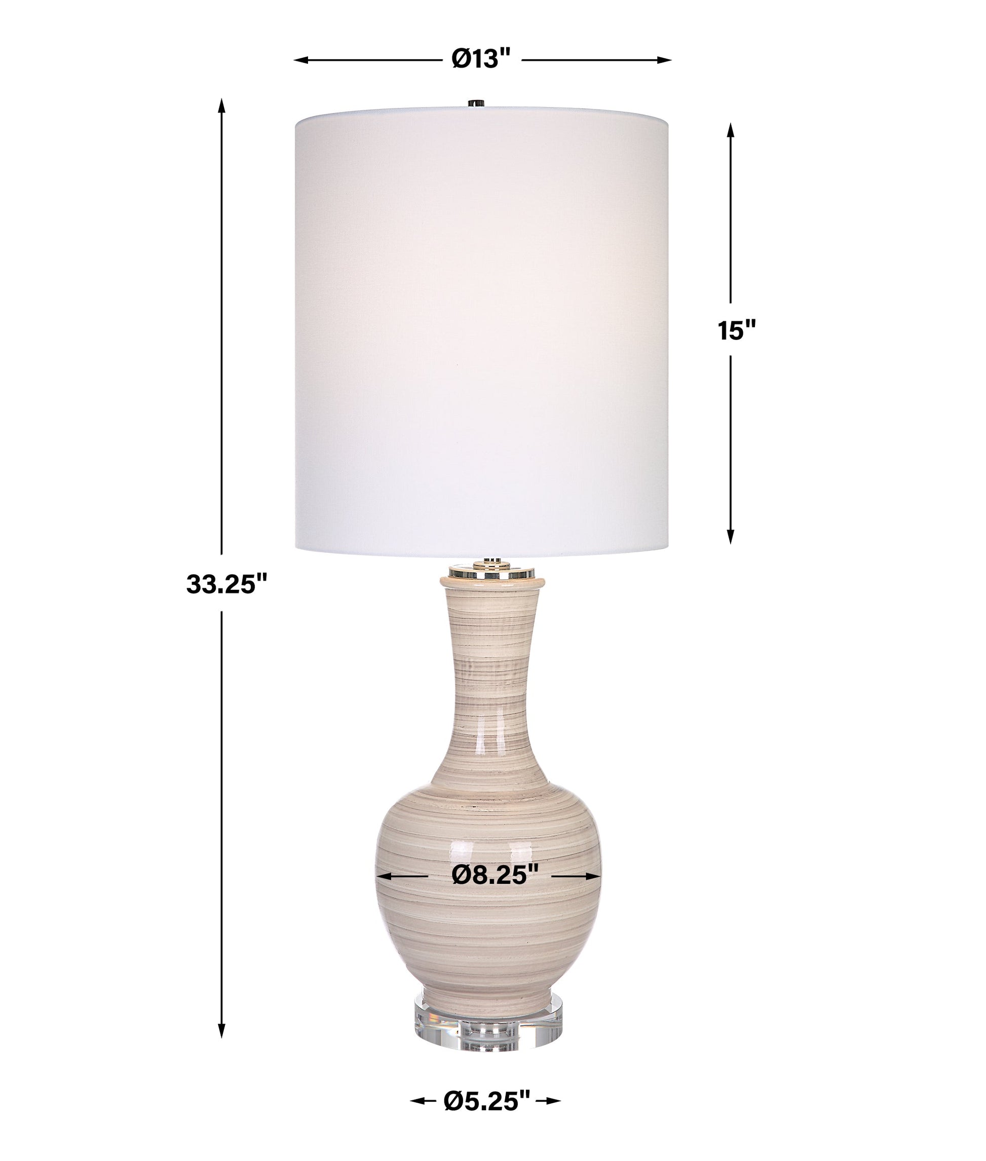 This Table Lamp Showcases A Traditional Curved Silhouette In A Striking Striped Motif. The Ceramic Base Displays Shades Of Taupe, Tan, And Charcoal And Is Accented By A Thick Crystal Foot With Polished Nickel Plated Details. The Round Hardback Shade Is Covered In A White Linen Fabric With Natural Slubbing. Overall Depth : 13 in Overall Width : 13 in Overall Height : 33.25 in