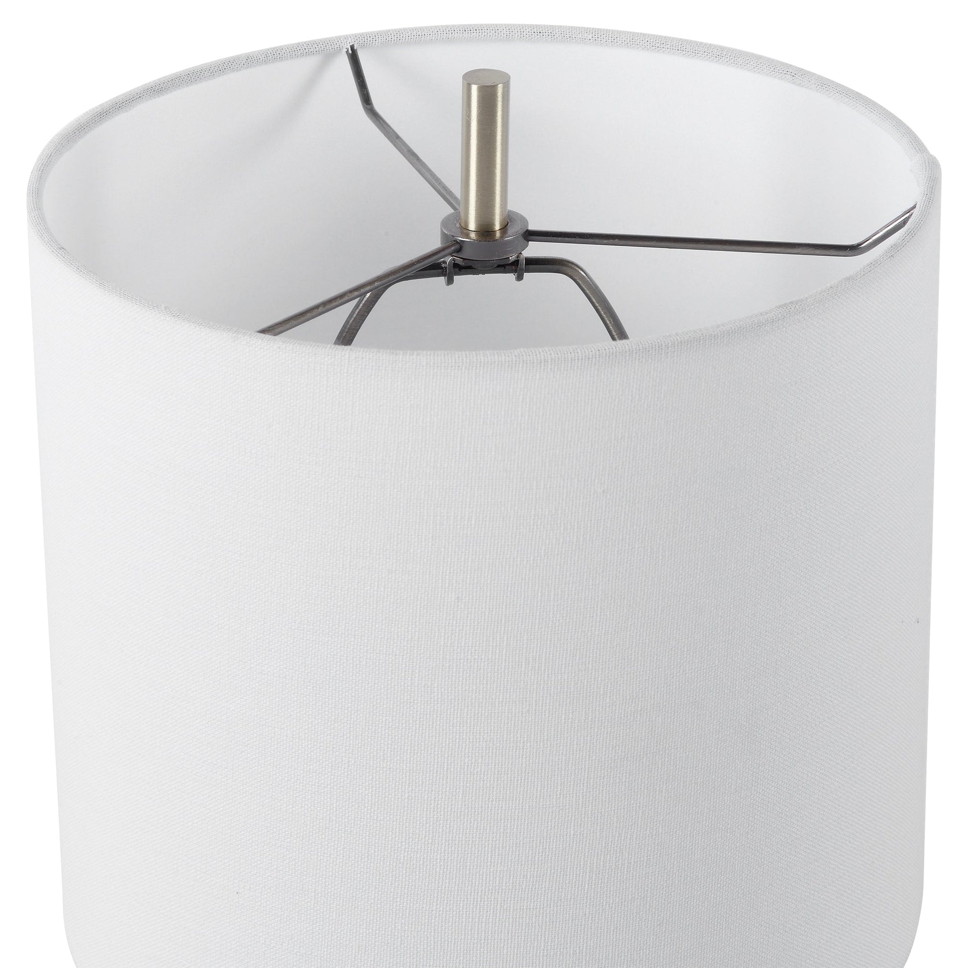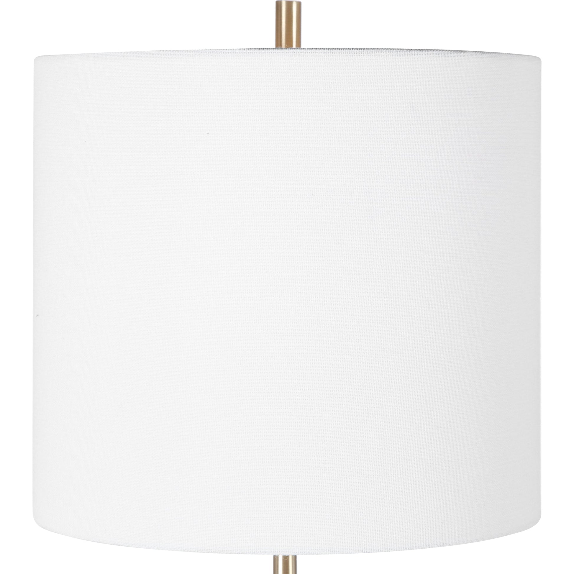 This Elegant Table Lamp Showcases A Thick White Marble Base With With Subtle Gray Veining, Accented With Brushed Light Brass Plated Details. The Lamp Is Paired With A White Linen Fabric, Round Drum Shade. Overall Depth : 10 in Overall Width : 10 in Overall Height : 20 in