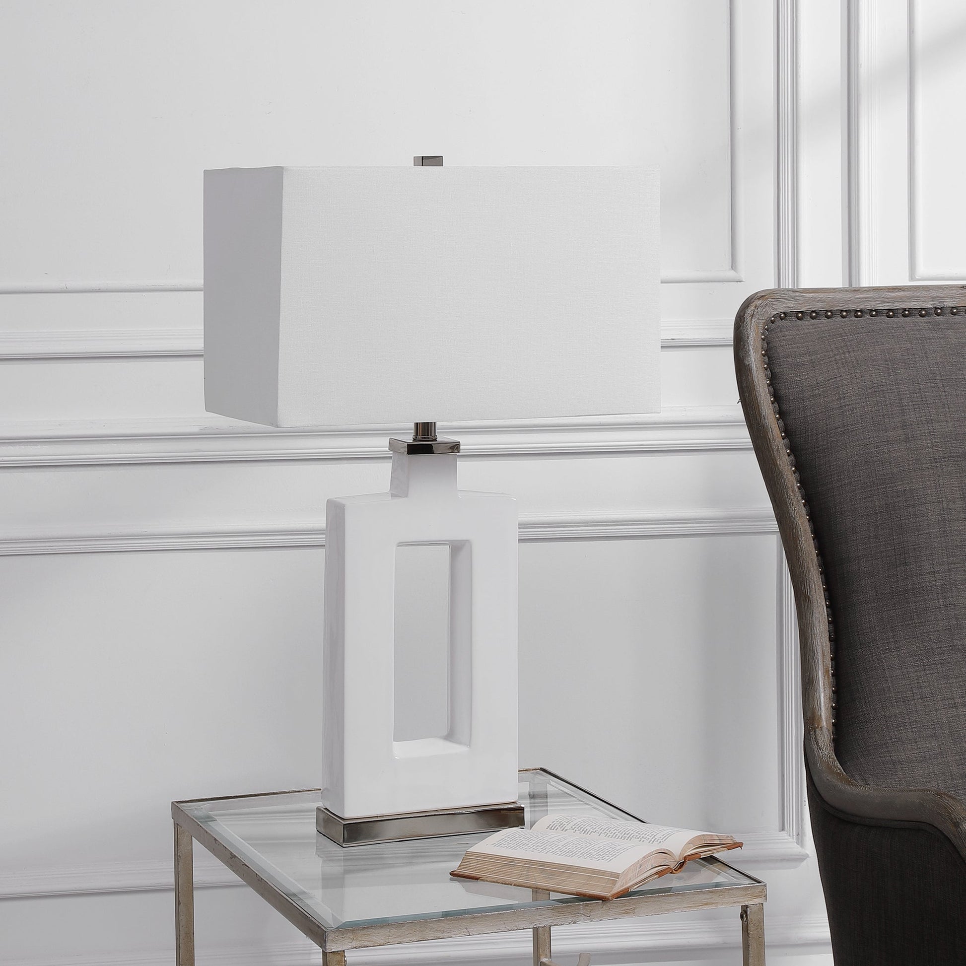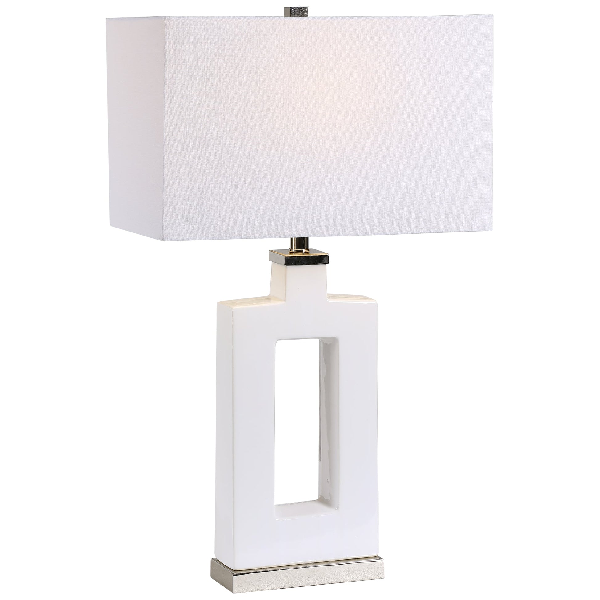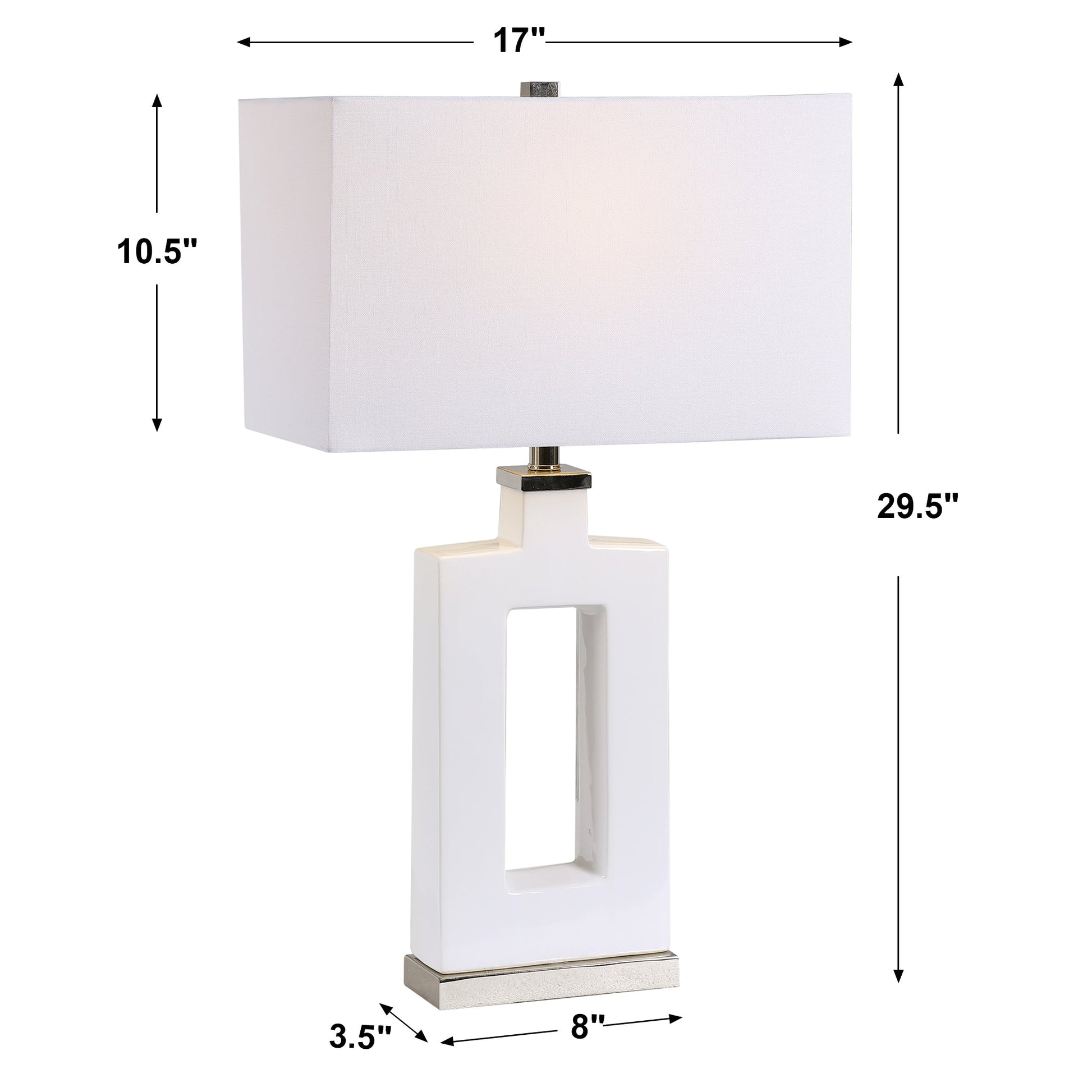 Showcasing A Sleek And Contemporary Look, This Ceramic Table Lamp Is Finished In A Stark White Glaze With Striking Polished Nickel Plated Iron Details. The Lamp Is Paired With A Rectangle Hardback Shade In White Linen Fabric. Overall Depth : 10 in Overall Width : 17 in Overall Height : 29.5 in