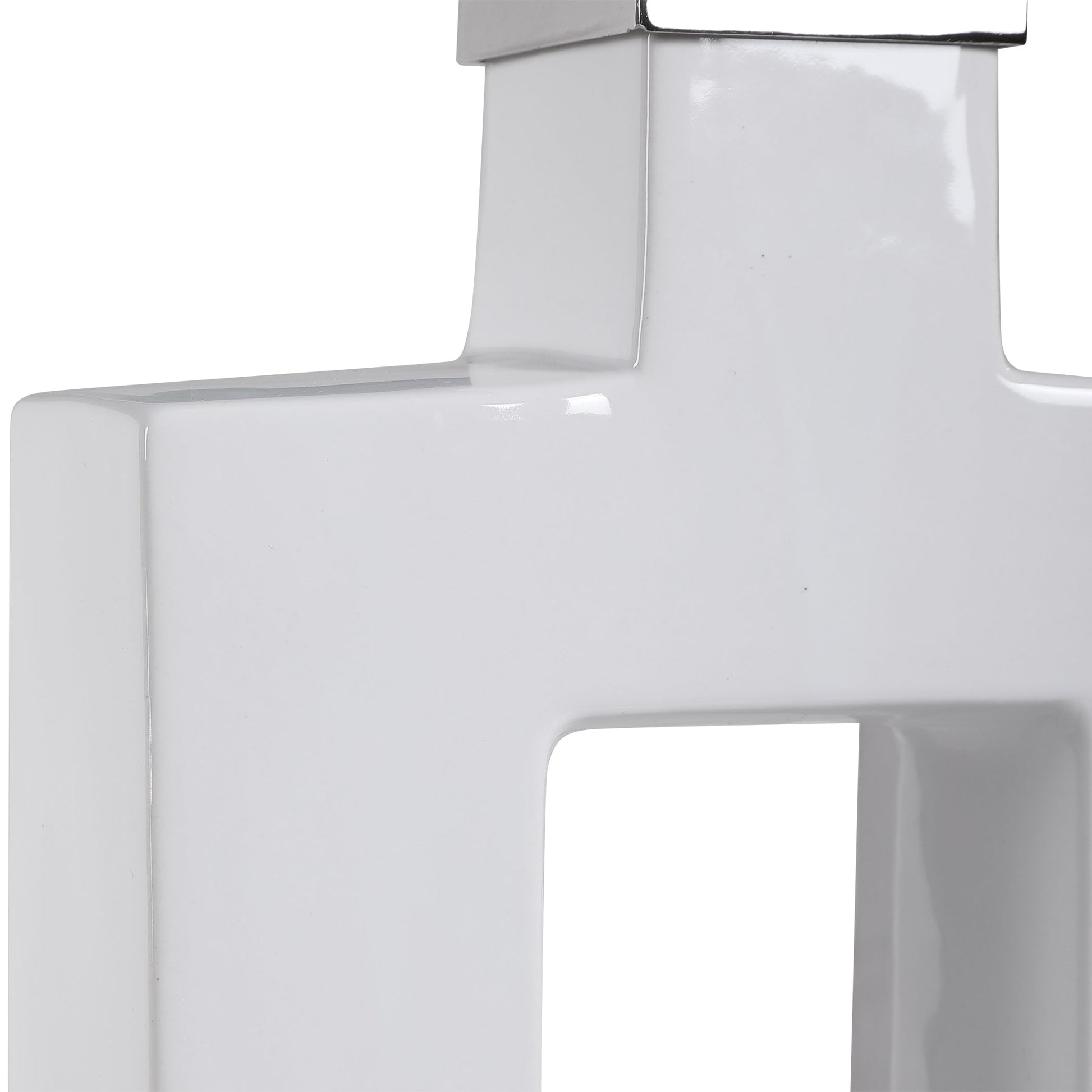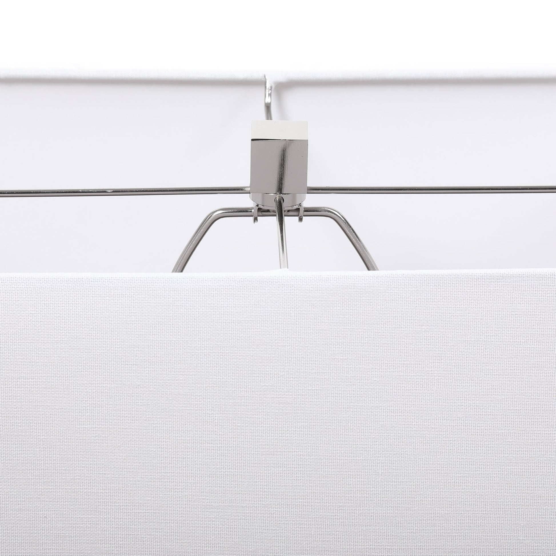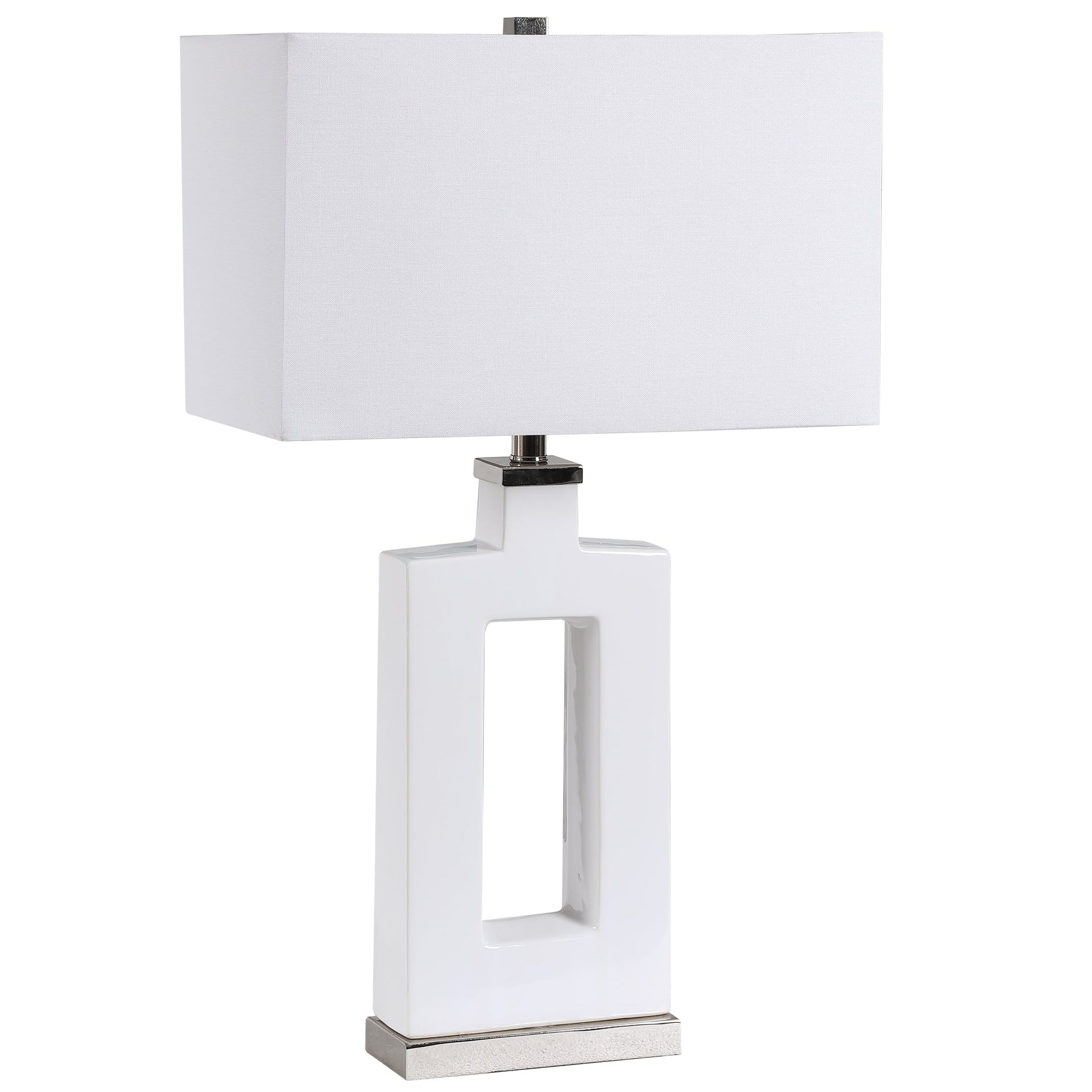 Showcasing A Sleek And Contemporary Look, This Ceramic Table Lamp Is Finished In A Stark White Glaze With Striking Polished Nickel Plated Iron Details. The Lamp Is Paired With A Rectangle Hardback Shade In White Linen Fabric. Overall Depth : 10 in Overall Width : 17 in Overall Height : 29.5 in
