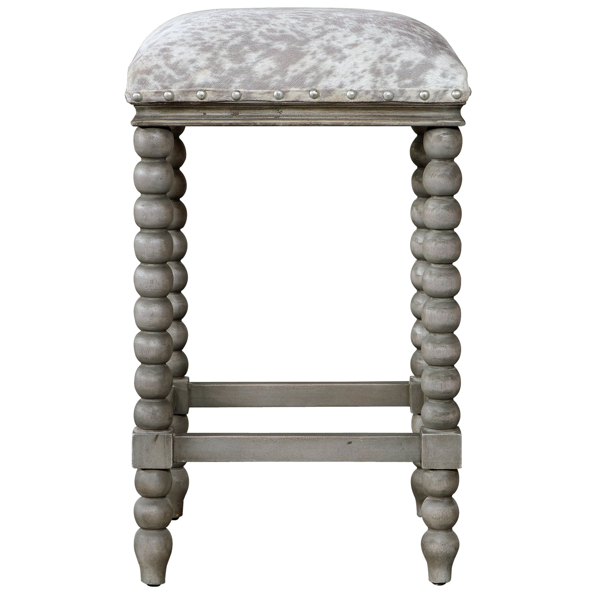 Ranch And Modern Lodge Styles Converge To Create This Plush, Upholstered Counter Stool. The Cushioned Seat Is Wrapped In A Light Gray And White Faux Cow Hide, Accented By Brushed Nickel Nail Head Trim And A Dry French Gray Stained Turned Wooden Base. Seat Height Is 26". Overall Depth : 15 in Overall Width : 15 in Overall Height : 26 in
