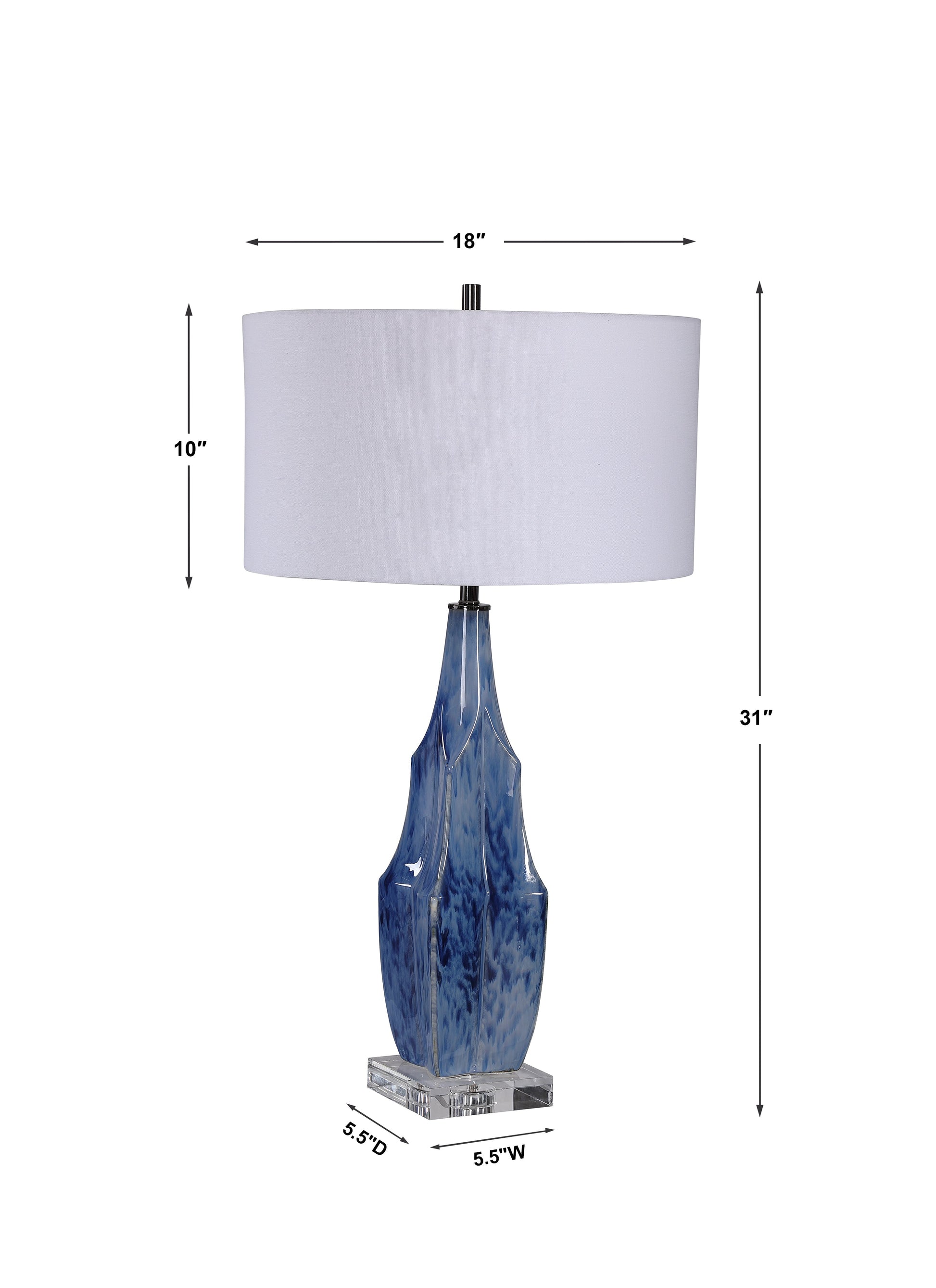 This Ceramic Table Lamp Is Finished In A Beautiful Reactive Indigo Blue Glaze, Accented By Elegant, Polished Nickel And Crystal Details. A White Linen Fabric Drum Shade Completes The Look. Overall Depth : 18 in Overall Width : 18 in Overall Height : 32.5 in