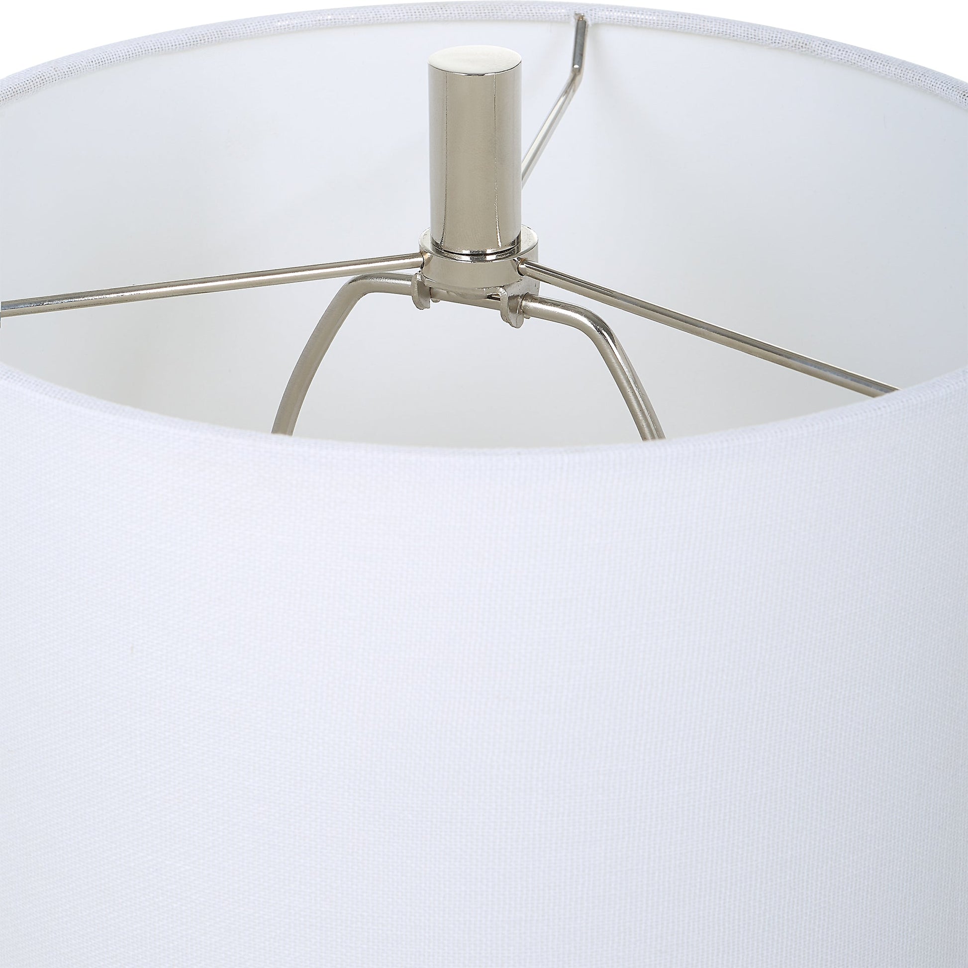 Sleek And Refined, This Contemporary Buffet Lamp Showcases A Streamlined Iron Base In Polished Nickel With Natural White Marble And Crystal Accents. Paired With A Hardback White Linen Fabric Drum Shade. Overall Depth : 10 in Overall Width : 10 in Overall Height : 33.5 in