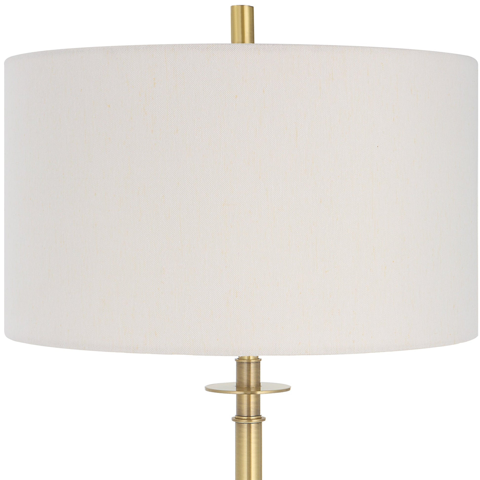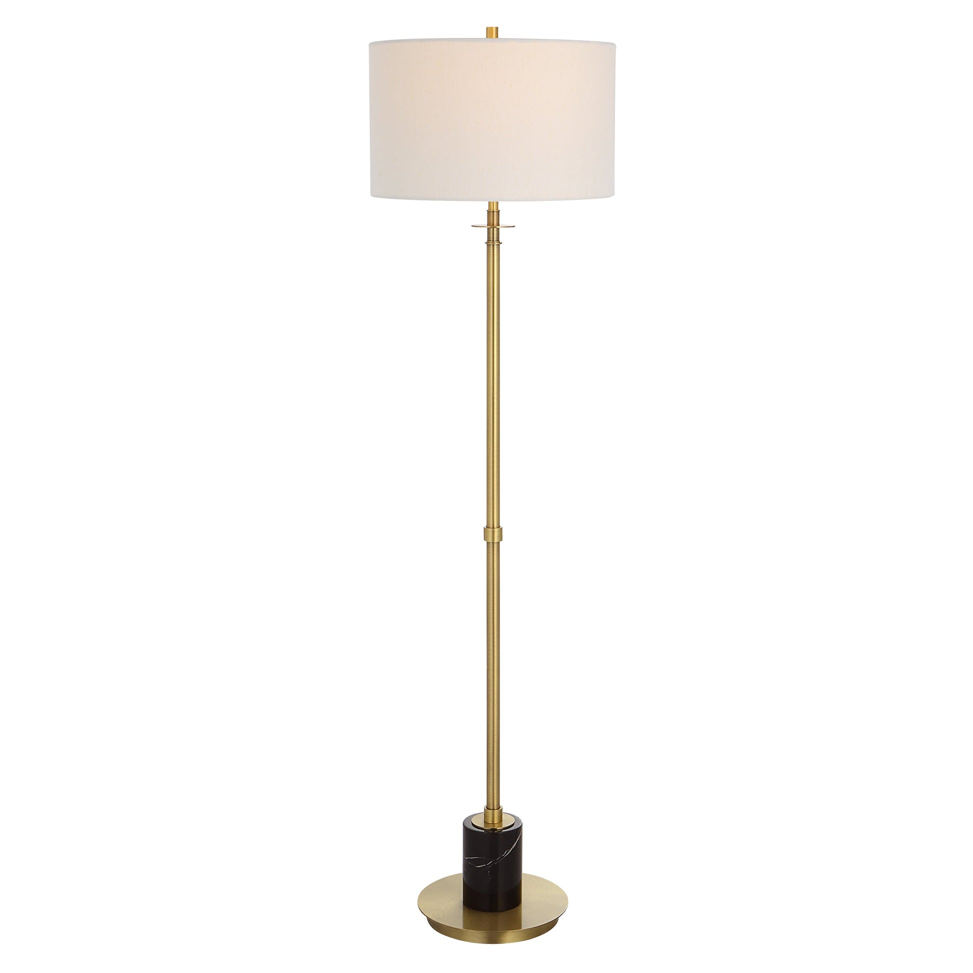This Sophisticated Design Showcases A Sleek Iron Base Finished In A Lightly Antiqued Plated Brass, Accented By A Substantial Black Marble Column Above The Foot. The Round Hardback Shade Is Covered In A White Linen Fabric. Overall Depth : 17 in Overall Width : 17 in Overall Height : 65 in