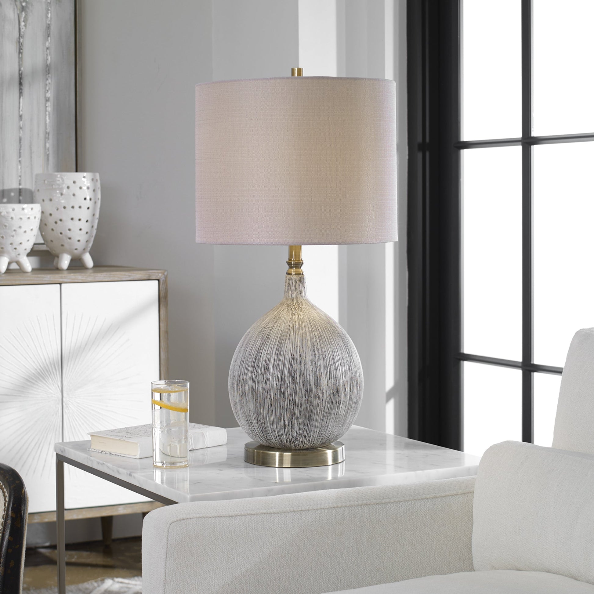 Organic Gourd Shaped Ceramic With A Heavily Textured Surface, Finished In An Old Ivory With Aged Black Undertones, Accented With Burnished Brass Plated Details. The Round Hardback Drum Shade Is A Light Beige Linen Fabric With Natural Slubbing. Overall Depth : 14 in Overall Width : 14 in Overall Height : 26.5 in