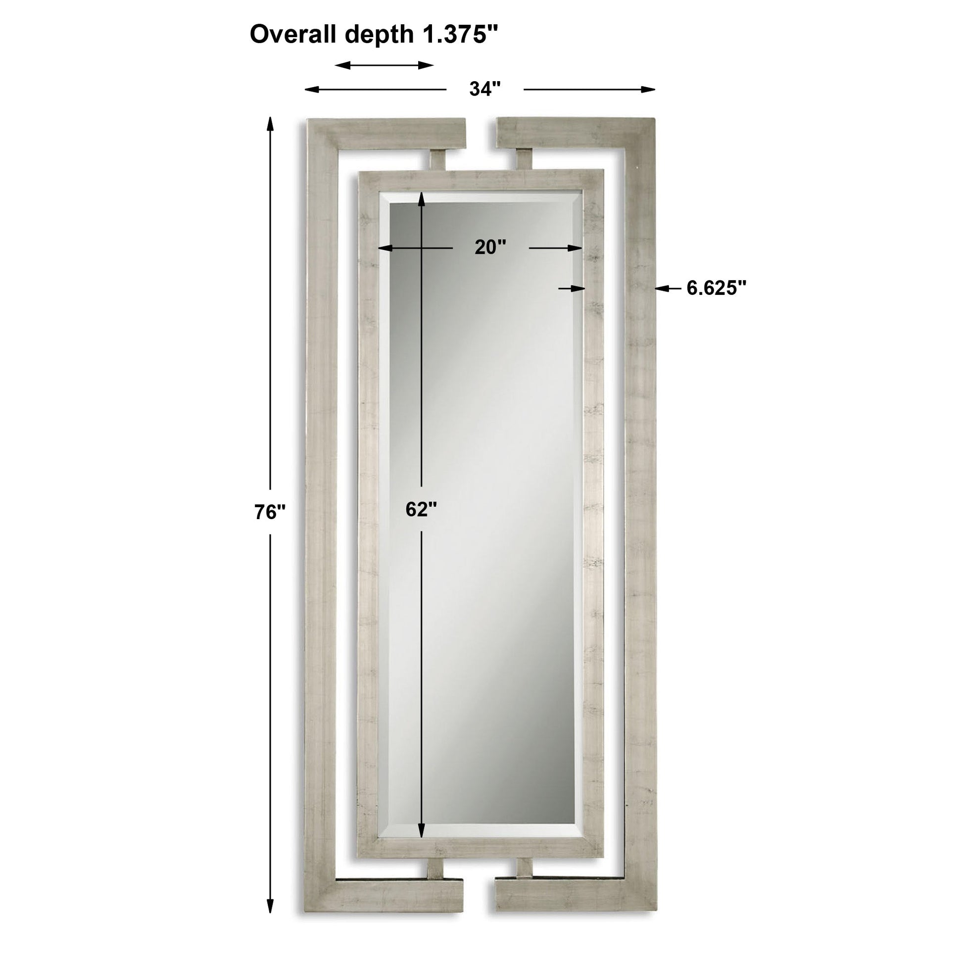 This Stately Mirror Features Dual Wooden Frames Attached At The Top And Bottom With A Scratched Silver Leaf Finish. Frames Have Open Detail For Wall Color To Show Through. Mirror Has A Generous 1 1/4" Bevel And May Be Hung Horizontal Or Vertical. Overall Depth : 1.375 in Overall Width : 34 in Overall Height : 76 in