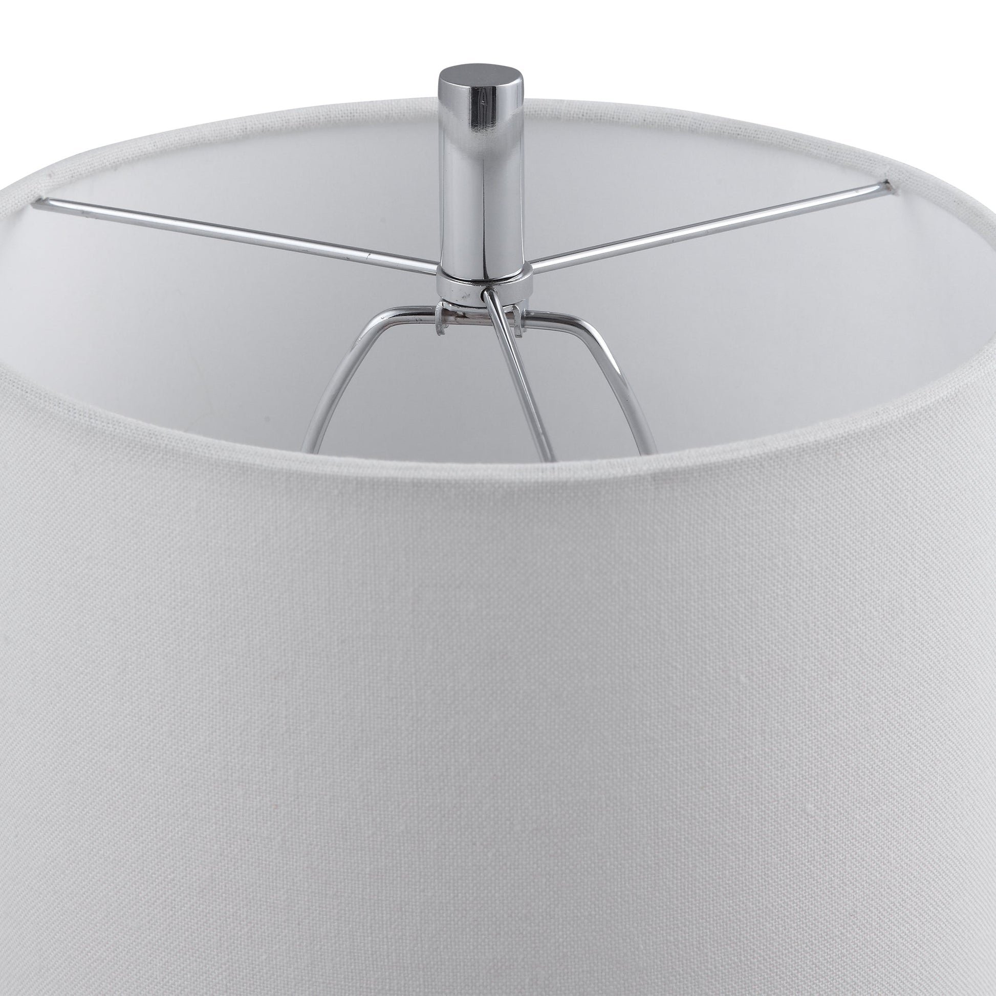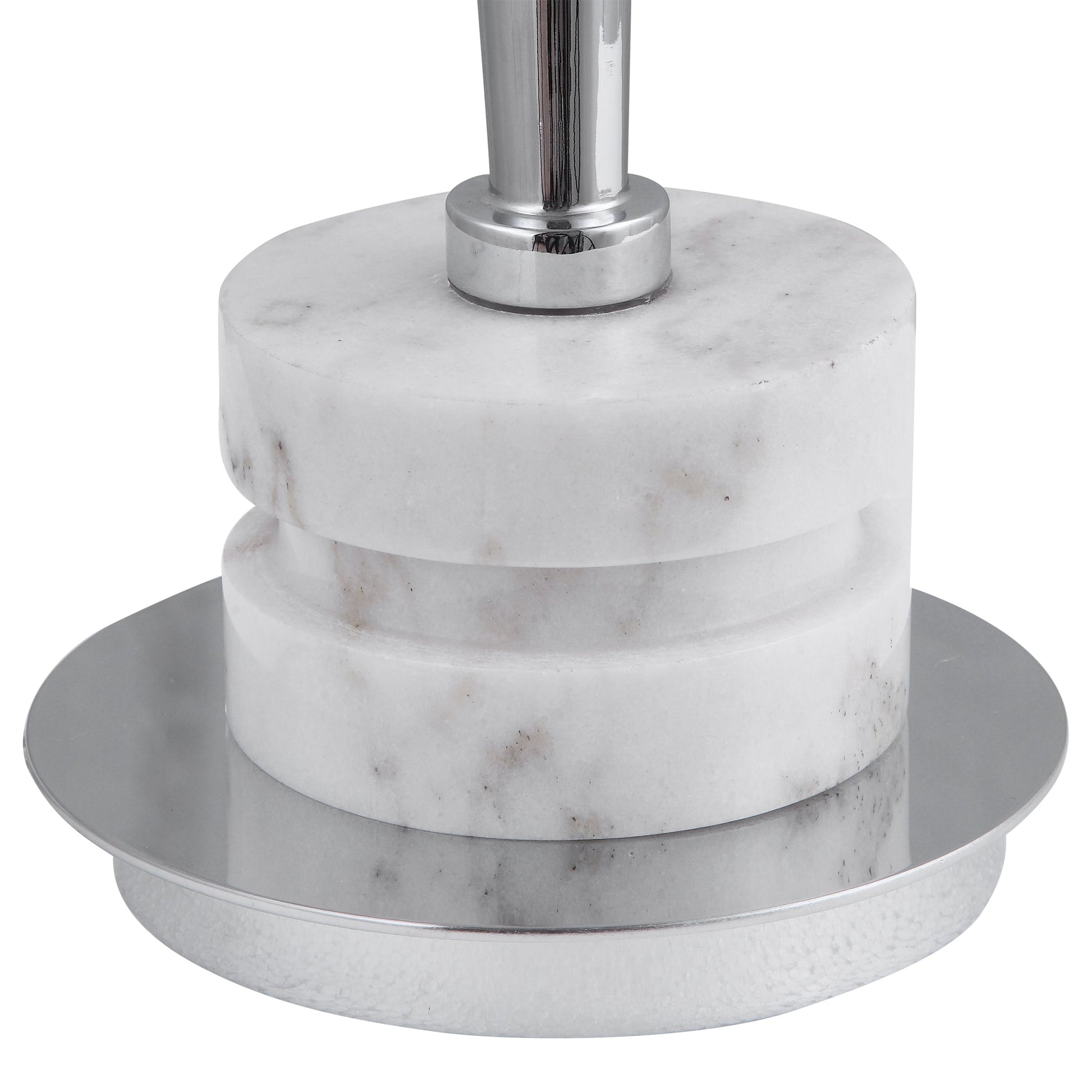This Buffet Lamp Features A Clean, Modern Look With A Chrome Plated Iron Base Paired With Polished White Marble Details With Light Gray Veining. The Round Hardback Drum Shade Is A White Linen Fabric. Overall Depth : 11 in Overall Width : 11 in Overall Height : 36 in