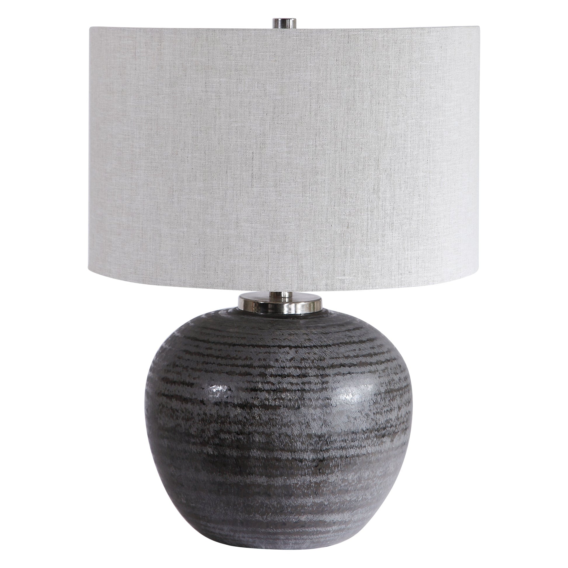 Finished In A Charcoal Glaze With Etched Texture, This Table Lamp Adds A Casual Yet Contemporary Feel To A Space. The Round Ceramic Base Is Complemented By Brushed Nickel Hardware. A Round Hardback Drum Shade In Oatmeal Linen Completes The Piece. Overall Depth : 16 in Overall Width : 16 in Overall Height : 21.75 in
