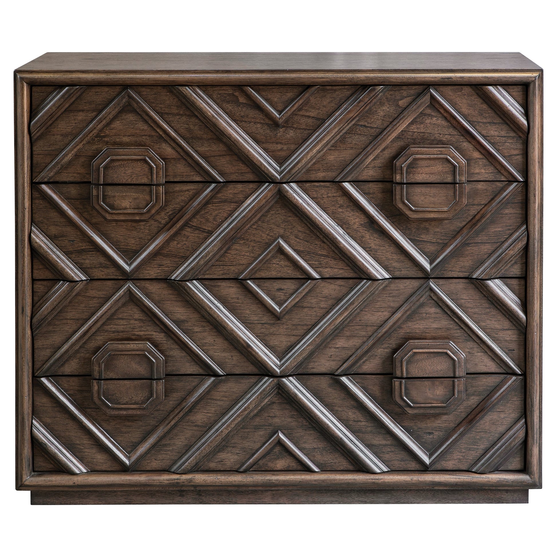 With A Transitional Deep Walnut Finish Over Mindi Veneer, Naturally Distressed And Hand Rubbed To Expose Natural Undertones, This Four Drawer Chest Features An Updated Geometric Carved Molding Front Over A Floating Plinth Base. Overall Depth : 18 in Overall Width : 43 in Overall Height : 36 in