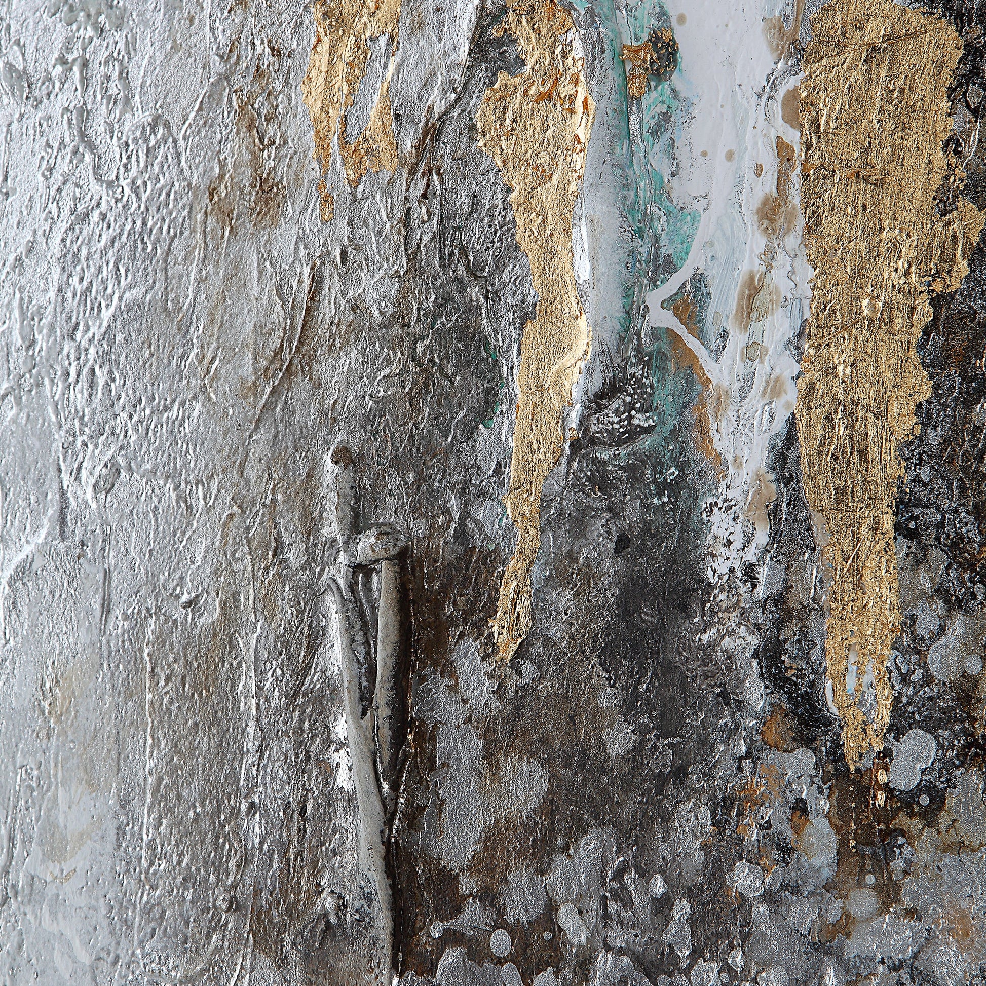 The Mountain Mist Hand Painting Showcases A Beautiful Balance Of Soft And Bold Hues. Framed Floating Gallery Style In A Satin Black Frame With An Abstract Aqua, Charcoal And White Palette, Accented By Gold And Silver Leaf. May Be Hung Horizontal Or Vertical. Overall Depth : 1.5 in Overall Width : 51.75 in Overall Height : 61.75 in