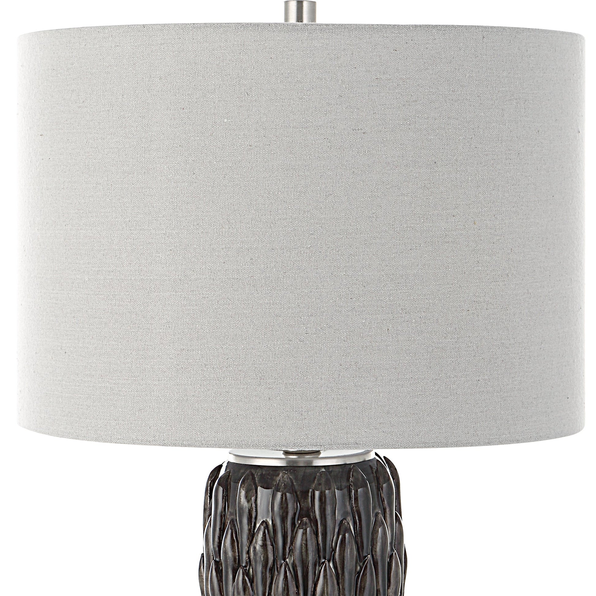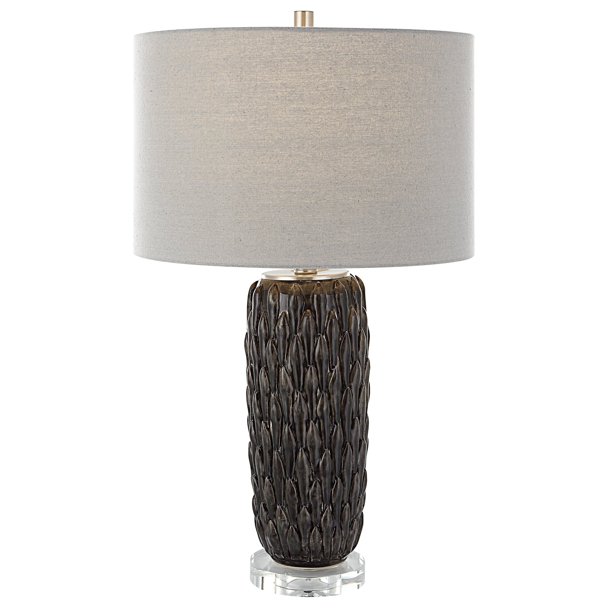 This Ceramic Table Lamp Features A Deep Mushroom Gray Glaze Over Carved Details, Accented With Polished Nickel Plated Details And An Elegant Crystal Foot. The Lamp Is Paired With A Hardback Drum Shade In Light Gray. Overall Depth : 15.5 in Overall Width : 15.5 in Overall Height : 26.5 in