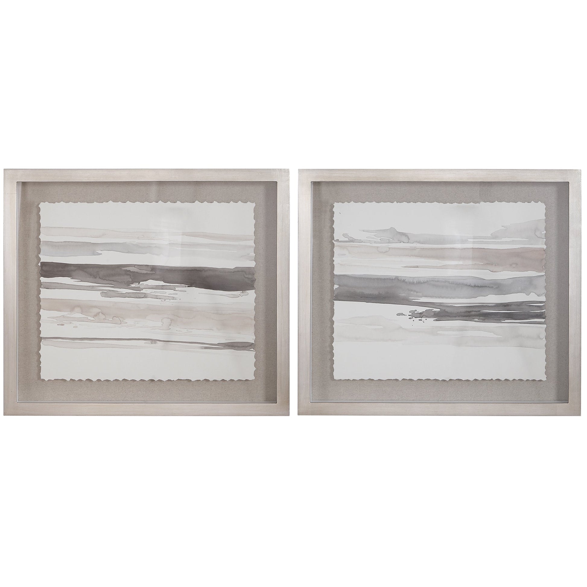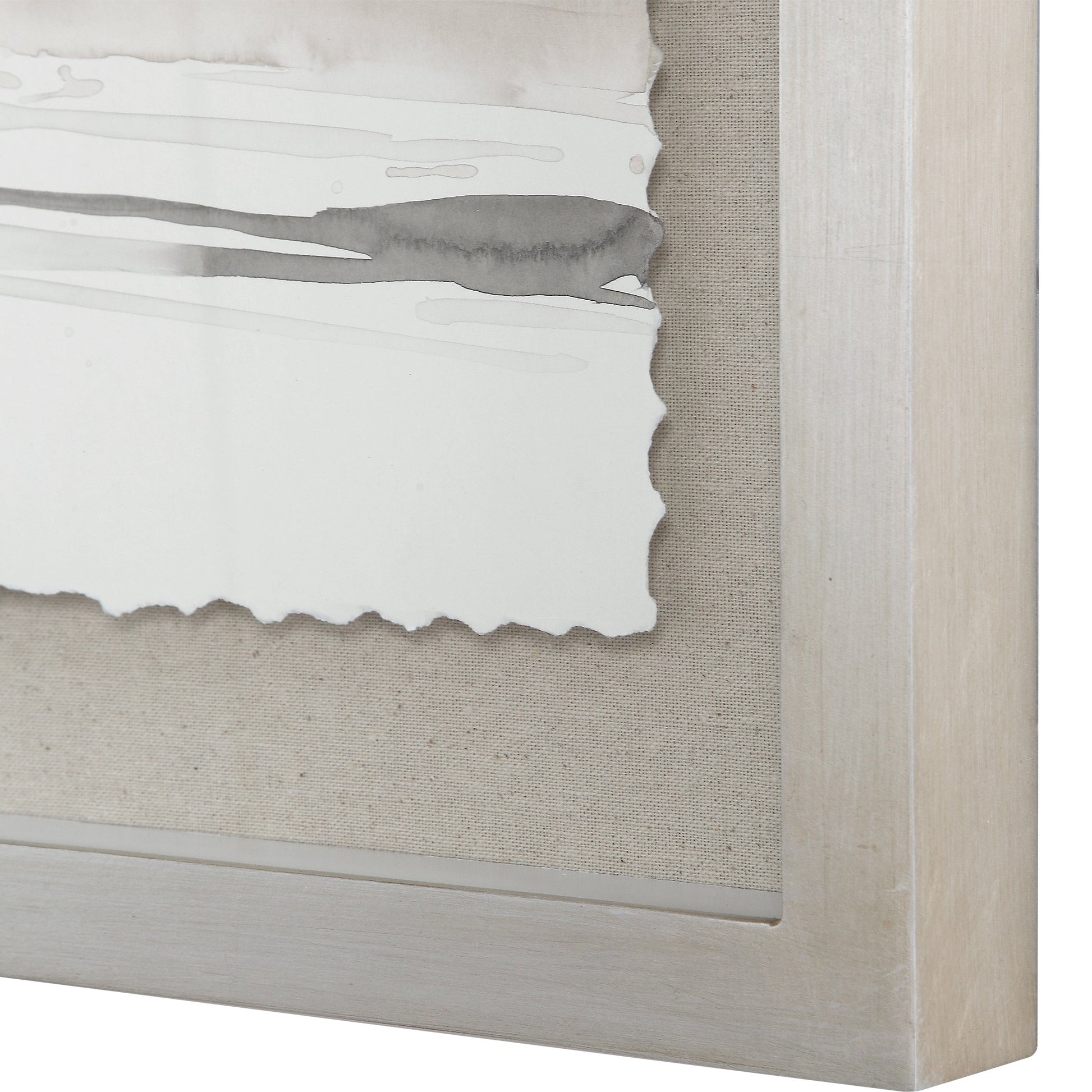 These Abstract Watercolors Add Transitional Style To A Space. Each Piece Features Light Gray, Charcoal, And White Hues On Deckled Parchment, Set Against An Oatmeal Linen Background. Each Original Watercolor Is Placed In A Champagne Silver Shadow Box Frame Under Protective Glass. This Artwork May Be Hung Horizontal Or Vertical. Overall Depth : 2.25 in Overall Width : 30 in Overall Height : 26 in