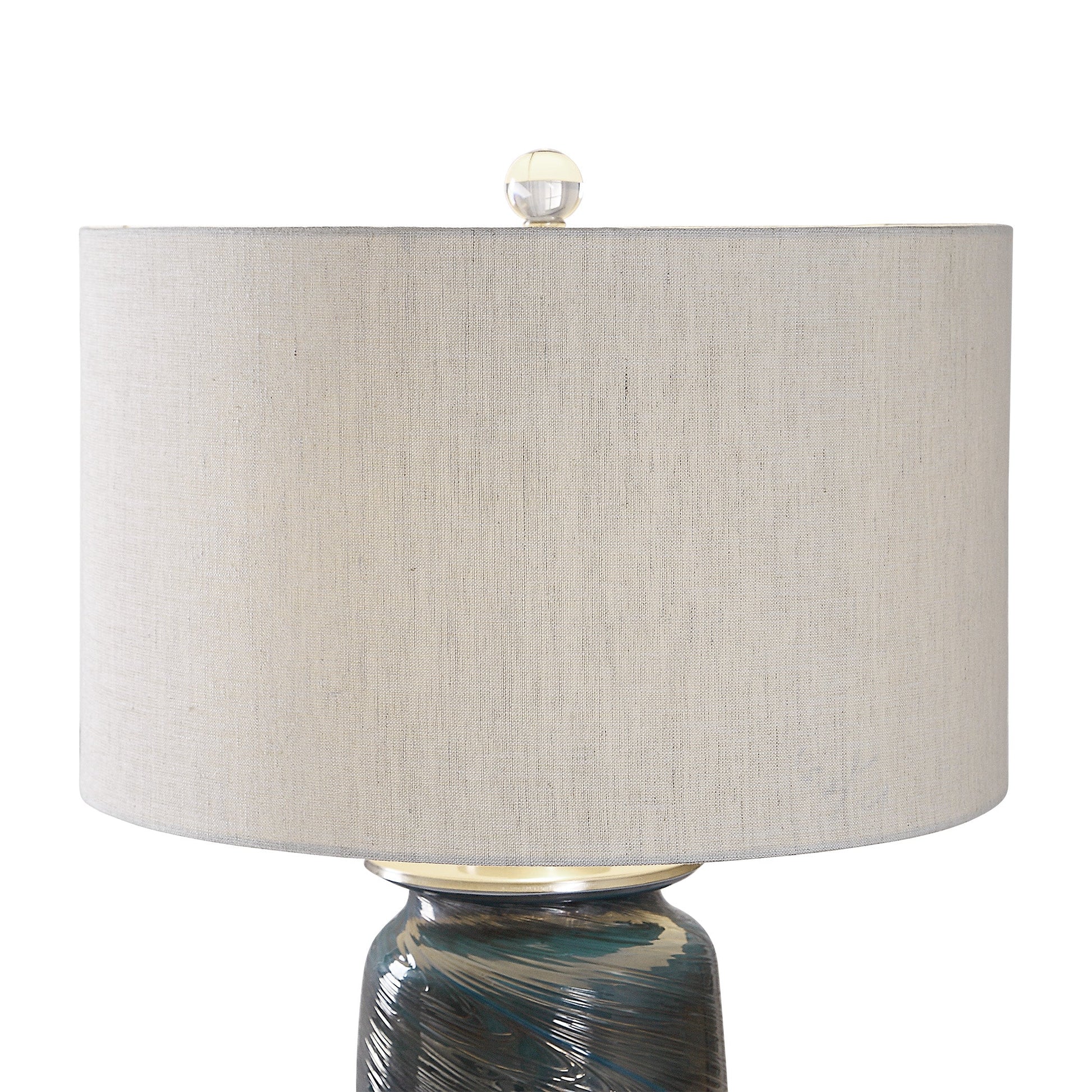 This Table Lamp Features A Decorative Glass Base That Showcases A Unique Swirl Texture, Highlighting Shades Of Ocean Blues, Greens And Metallic Bronze. Accenting These Vibrant Colors Are Brushed Nickel Plated Details And A Thick Crystal Foot. The Round Hardback Drum Shade Is A Light Beige Linen Fabric With Natural Slubbing. Overall Depth : 16 in Overall Width : 16 in Overall Height : 30.25 in