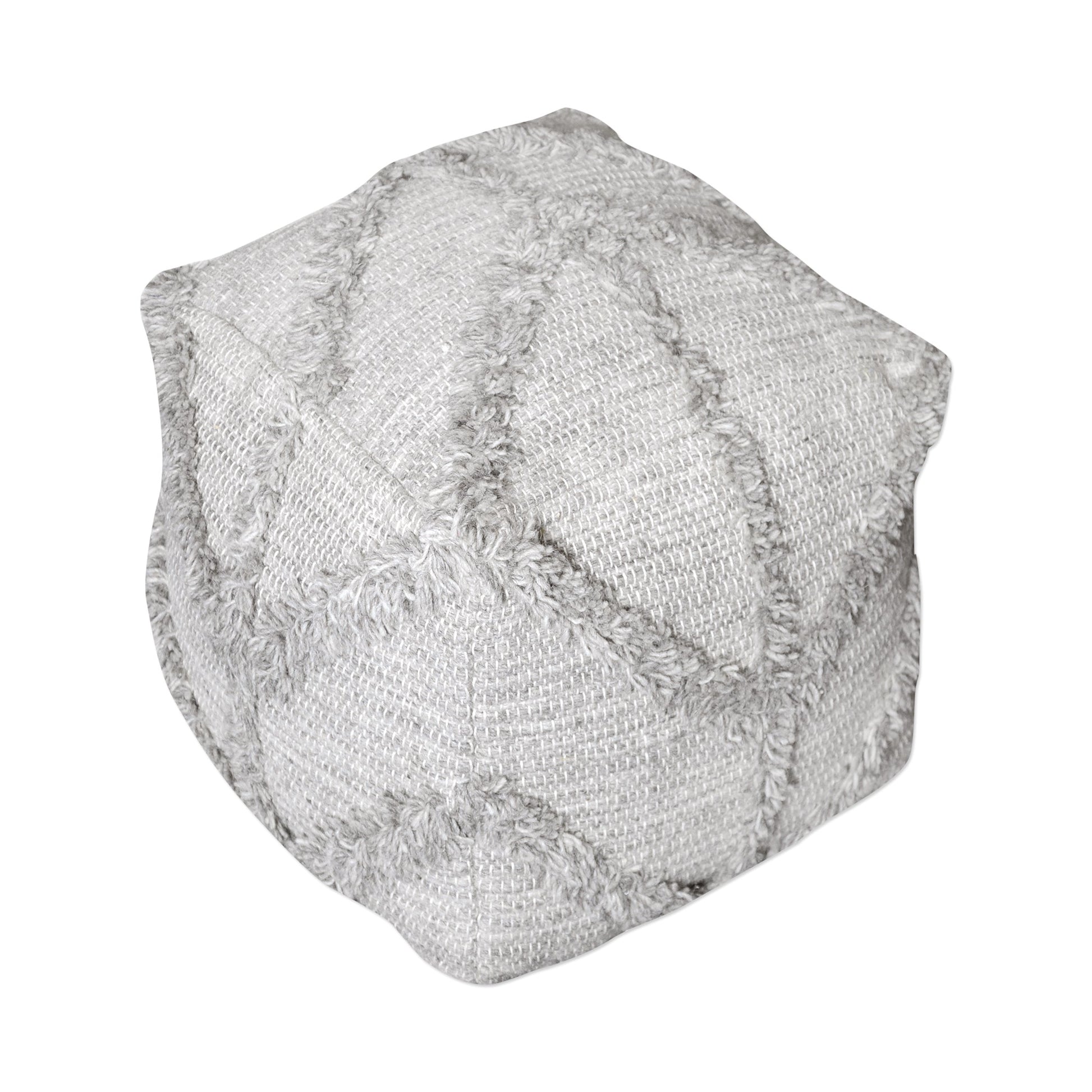 Handwoven From 100% Wool In Easy Shades Of Gray, Accented With A Textured Geometric Fringe. Has Versatile Use As An Ottoman, Extra Seating For Guests, Or Even An Accent Table When Topped With A Decorative Tray. Overall Depth : 18 in Overall Width : 18 in Overall Height : 18 in