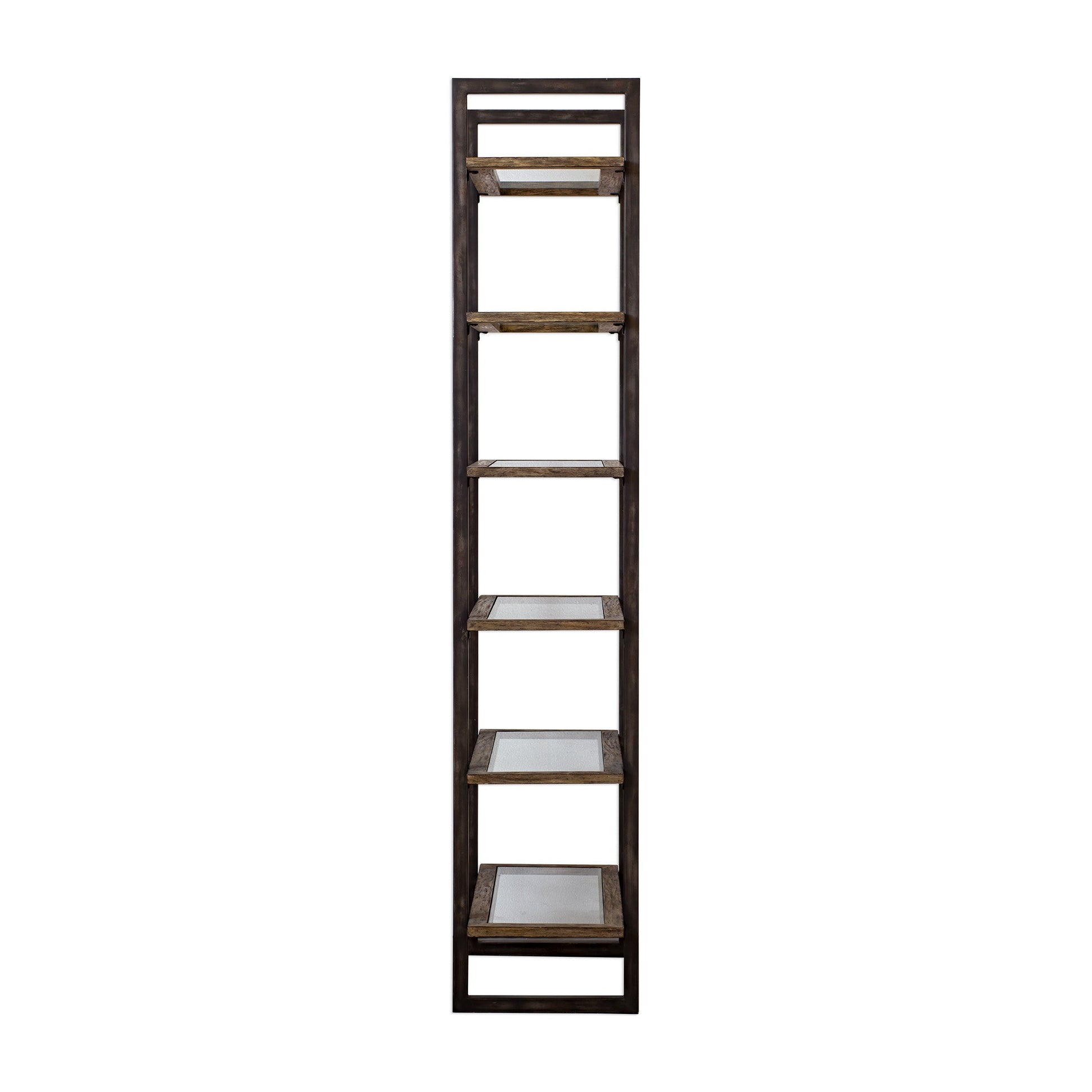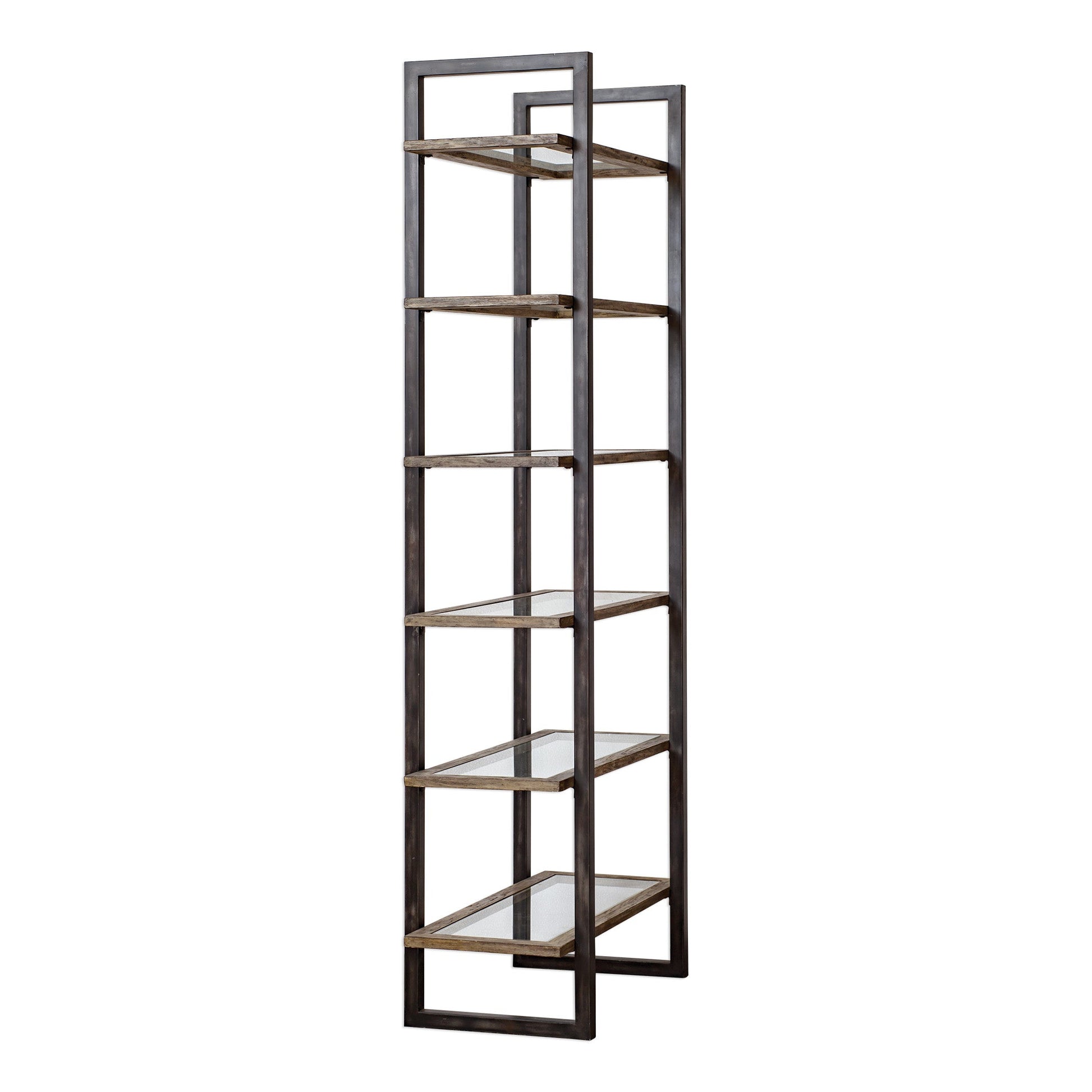 This Forged Iron Framed Etagere, Finished In Aged Steel With Light Distressing Features Six Display Shelves With Driftwood Finished Surrounds, Inset With Clear Glass. Overall Depth : 18 in Overall Width : 36 in Overall Height : 90 in