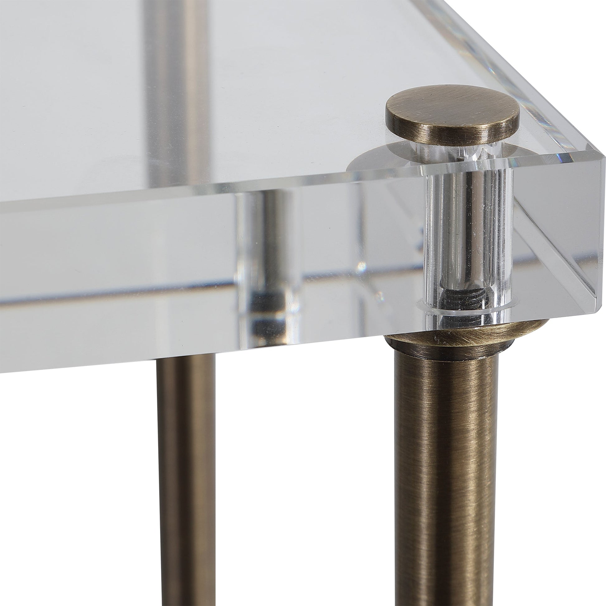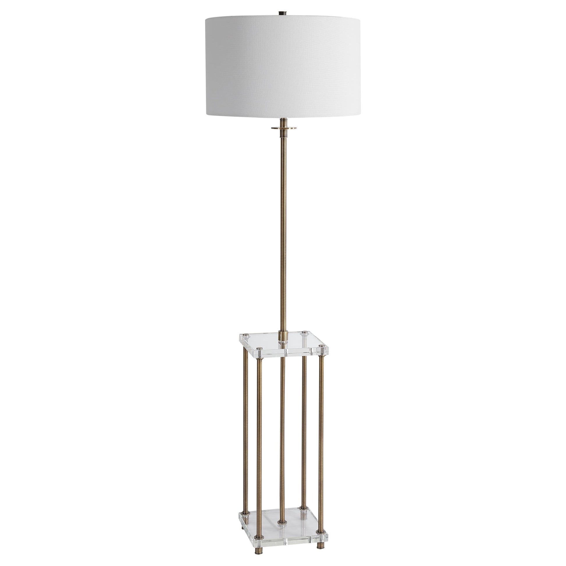 Sophisticated And Elegant, This Floor Lamp Displays A Transitional Look With Sleek Iron Details Finished In A Plated Antique Brass And Thick Crystal Shelves. The Drum Shade Is Covered In A White Linen Fabric. Overall Depth : 18 in Overall Width : 18 in Overall Height : 66.5 in
