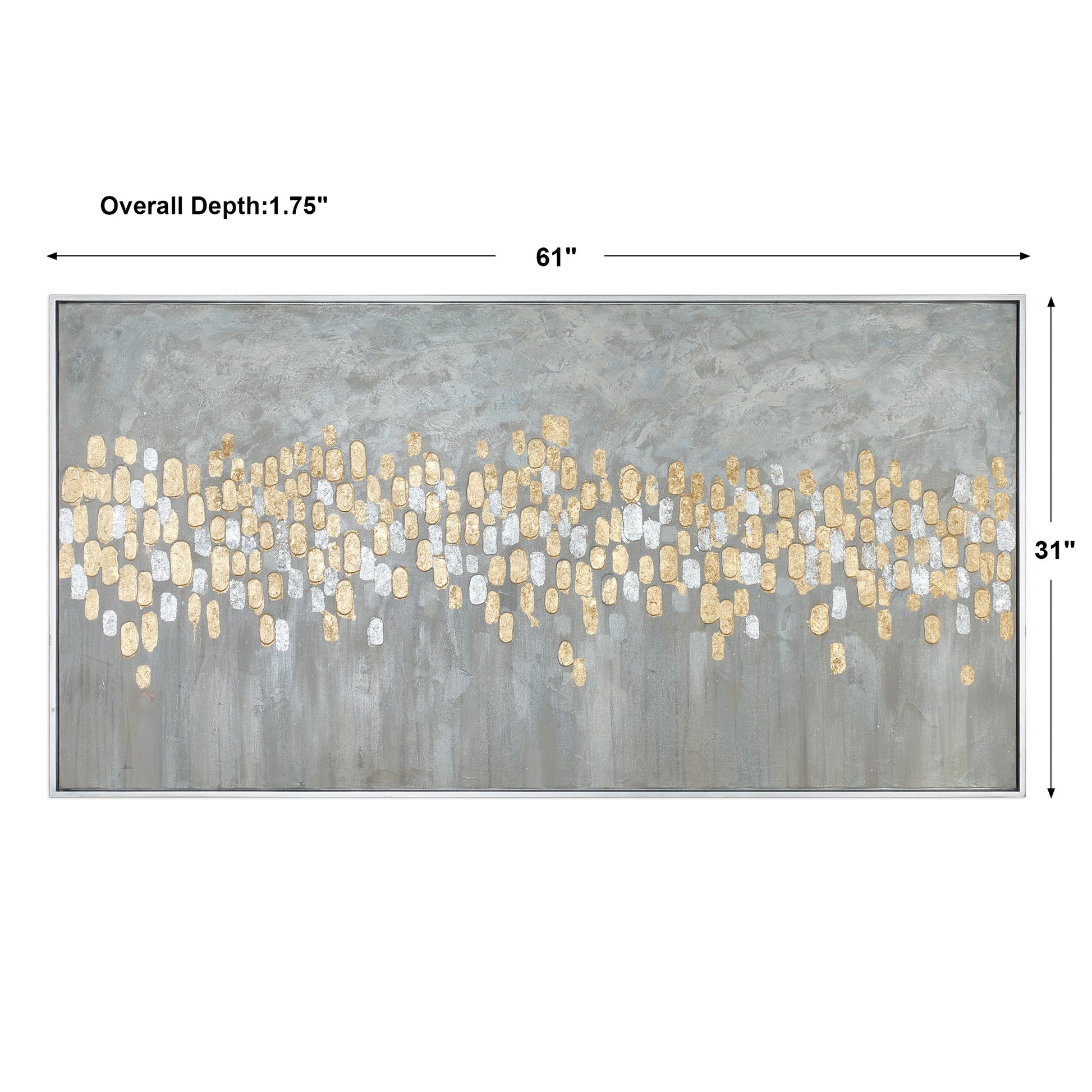 This Hand Painted Artwork On Canvas Emanates Contemporary Style, With A Modern Edge. A Textured, Gray, And Taupe Background Is Accented By Bright, Metallic Gold And Silver Leaf Raised Bars. The Eye-catching Abstract Is Stretched And Applied To A Wooden Frame. A Petite, Silver Leaf Gallery Frame Completes The Piece. Due To The Handcrafted Nature Of This Artwork, Each Piece May Have Subtle Differences. Overall Depth : 1.75 in Overall Width : 61 in Overall Height : 31 in