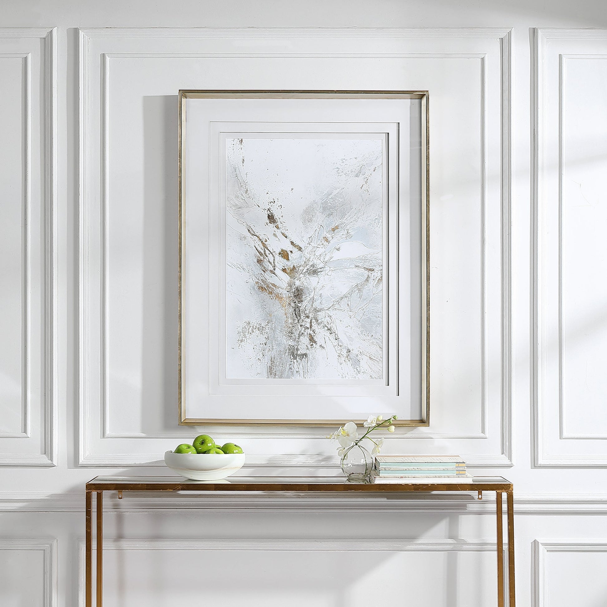 Create An Elegant Statement With This Feminine Abstract Print. The Neutral Artwork Features Shades Of Light Gray, White, And Gold Leaf. Triple White Matting And A Warm Silver Leaf Frame Complete This Sophisticated Piece. Print Is Placed Under Glass. Artwork By Jennifer Gardner. Overall Depth : 2.5 in Overall Width : 37.5 in Overall Height : 49.5 in