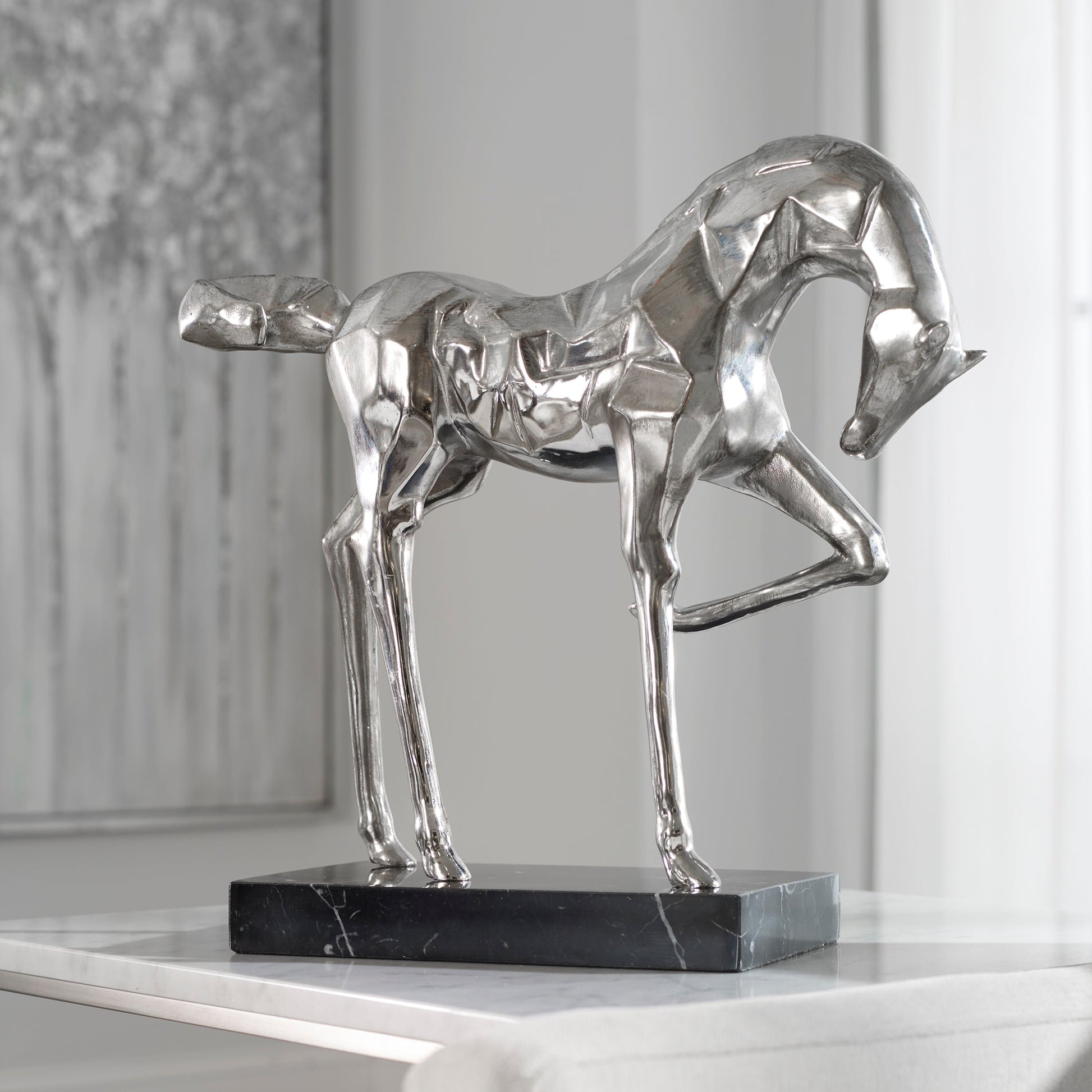 Lightly Antiqued, Brushed Nickel Plated Prancing Horse Set On A Black Marble Base. Overall Depth : 7 in Overall Width : 18.5 in Overall Height : 18 in