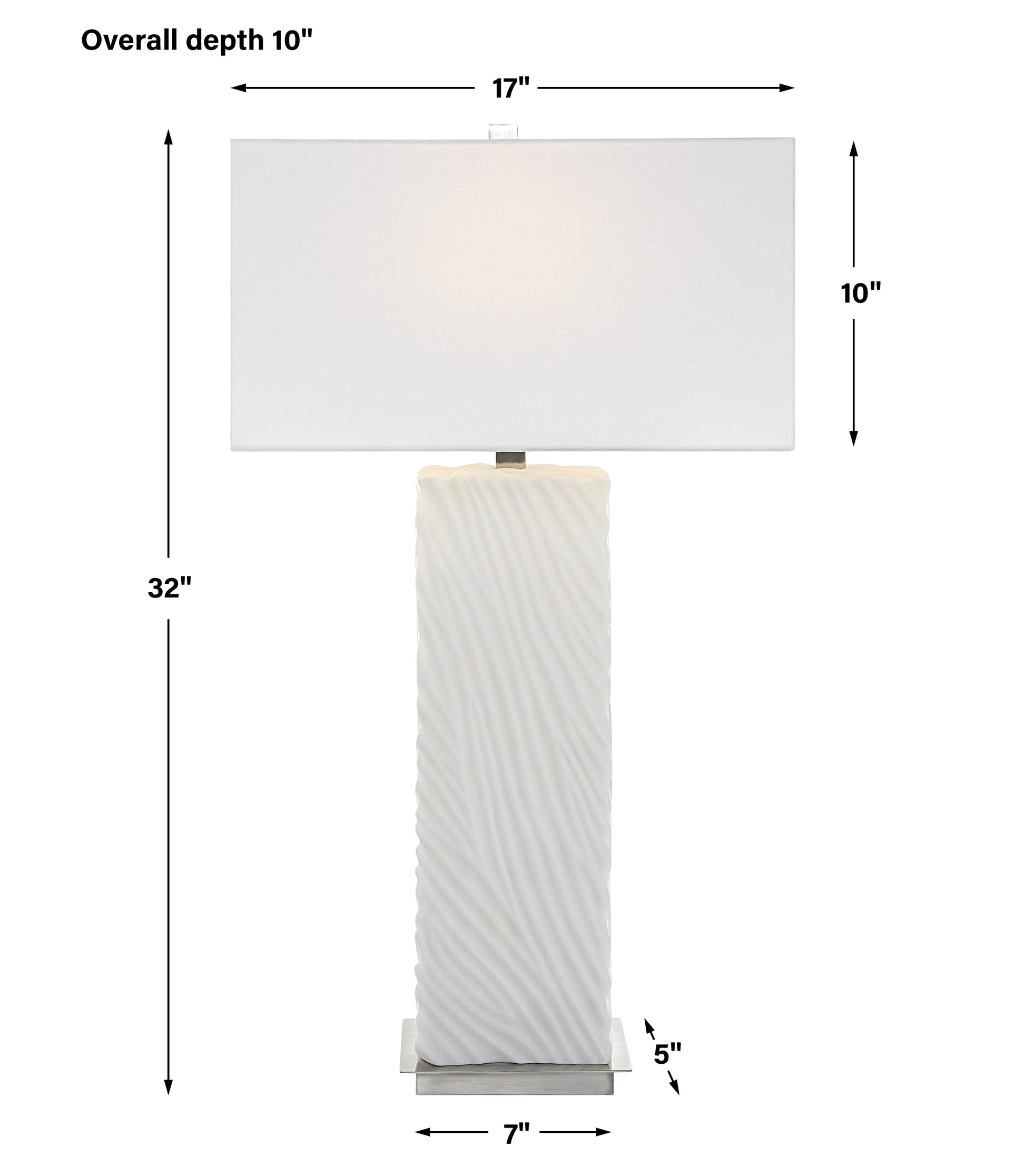 Stylish And Sophisticated, This Table Lamp Is Executed In A Rich Carved Ivory Man-made Stone That Accurately Replicates The Look Of Thassos Marble And Is Accented By Brushed Nickel Finished Iron Details. A Rectangle Hardback Shade In White Linen Complements The Design. Overall Depth : 10 in Overall Width : 17 in Overall Height : 32 in