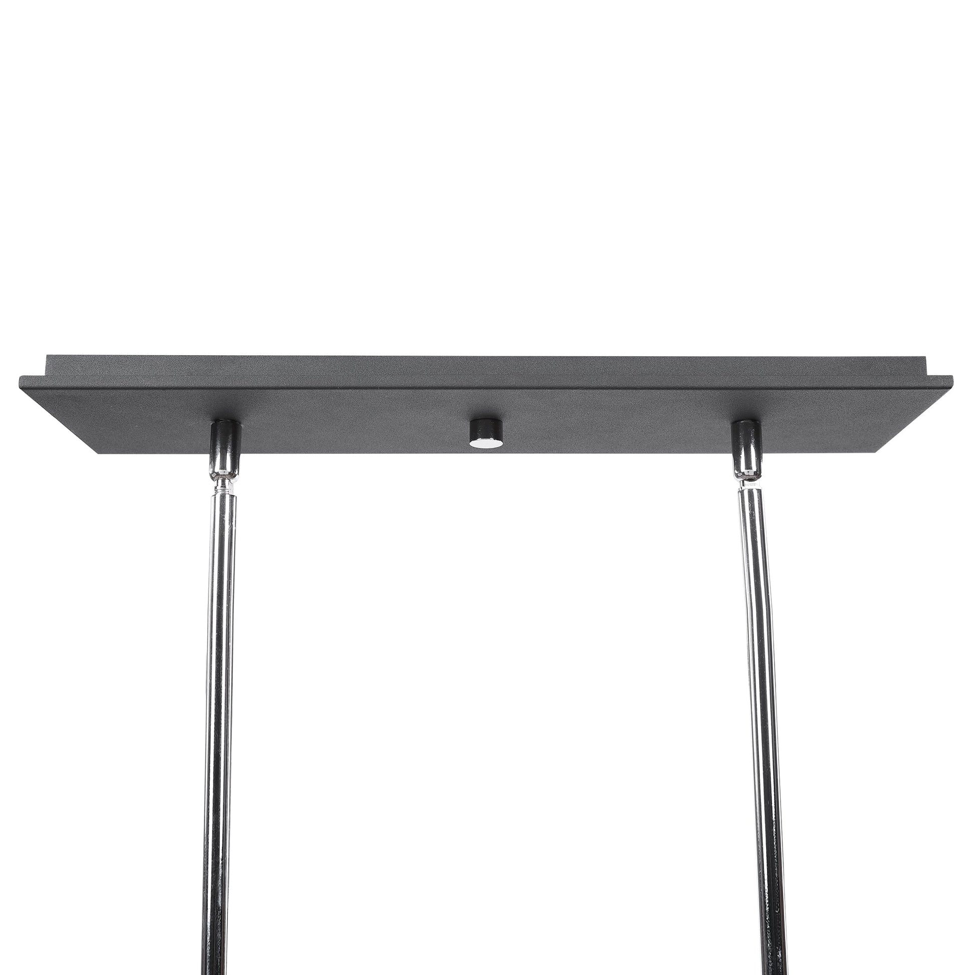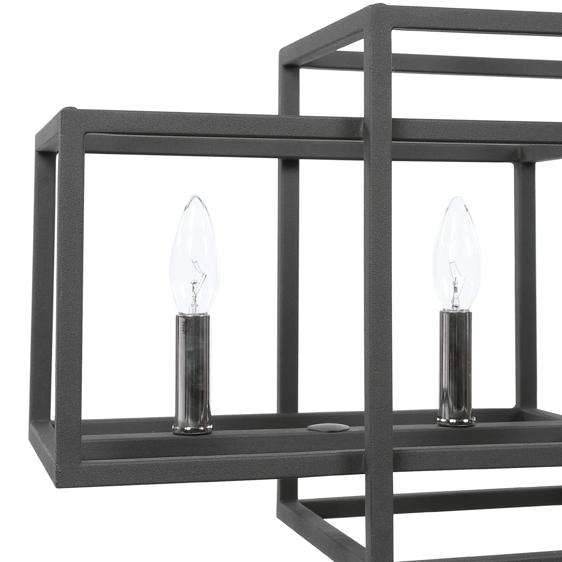 Clean Rectangles In A Sanded Black Texture Finish With Polished Nickel Accents Complete This 6 Lt. Linear Chandelier. 6-60 Watt Max, Candelabra Sockets.Bulbs Not Included. Supplied With 15' Wire, 6-12" Stems And 2-6" Stems For Adjustable Installation. Overall Depth : 9 in Overall Width : 44 in Overall Height : 12.5 in
