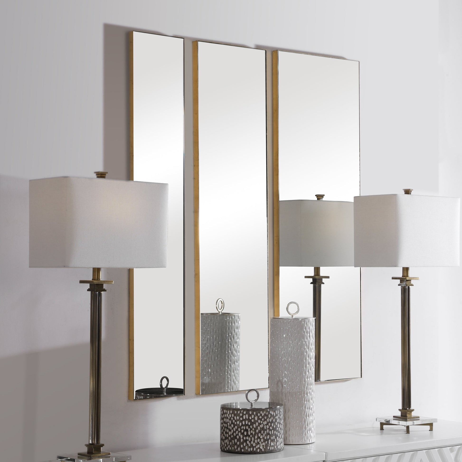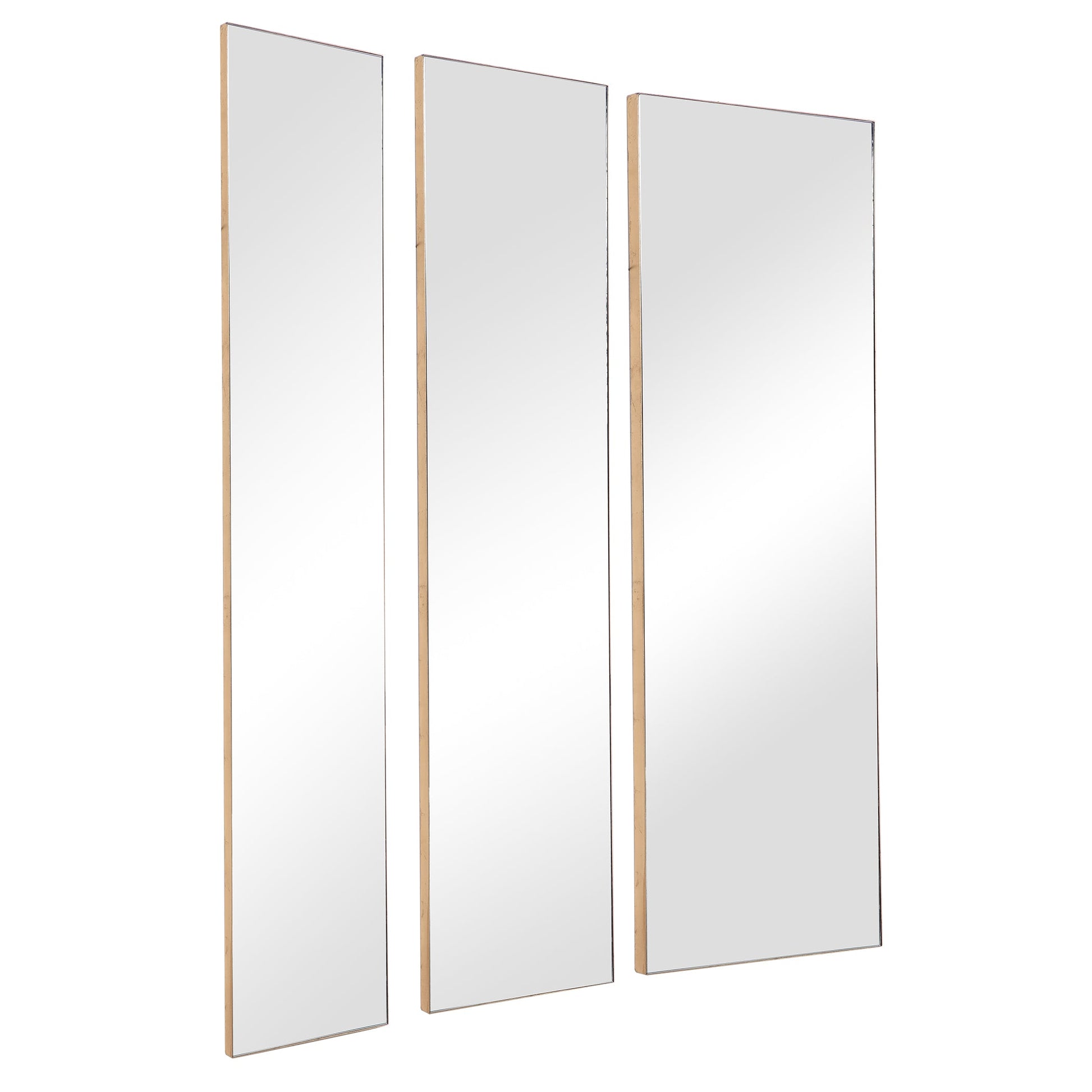 This Set Of Three Mirrors Showcase Simple, Clean Lines With Gold Leaf Finished Metal Profile Frames. Each Mirror May Be Hung Horizontal Or Vertical, Allowing For Multiple Modern Display Options. Sizes: S-8"x47", M-12"x47", L-16"x47" Overall Depth : 1.125 in Overall Width : 16 in Overall Height : 47 in