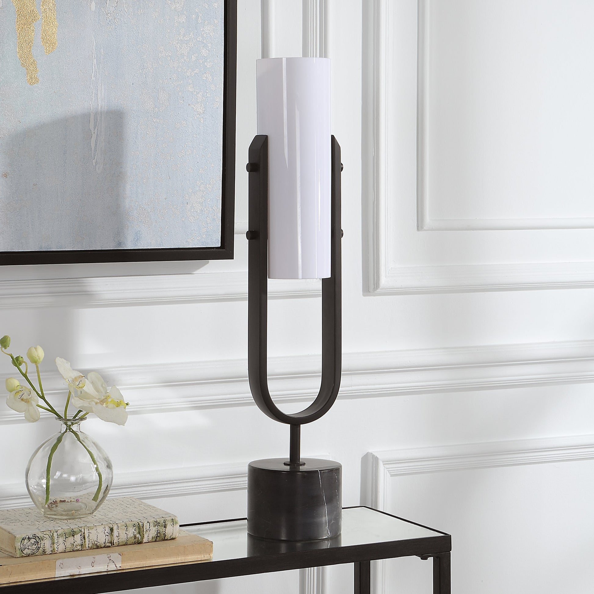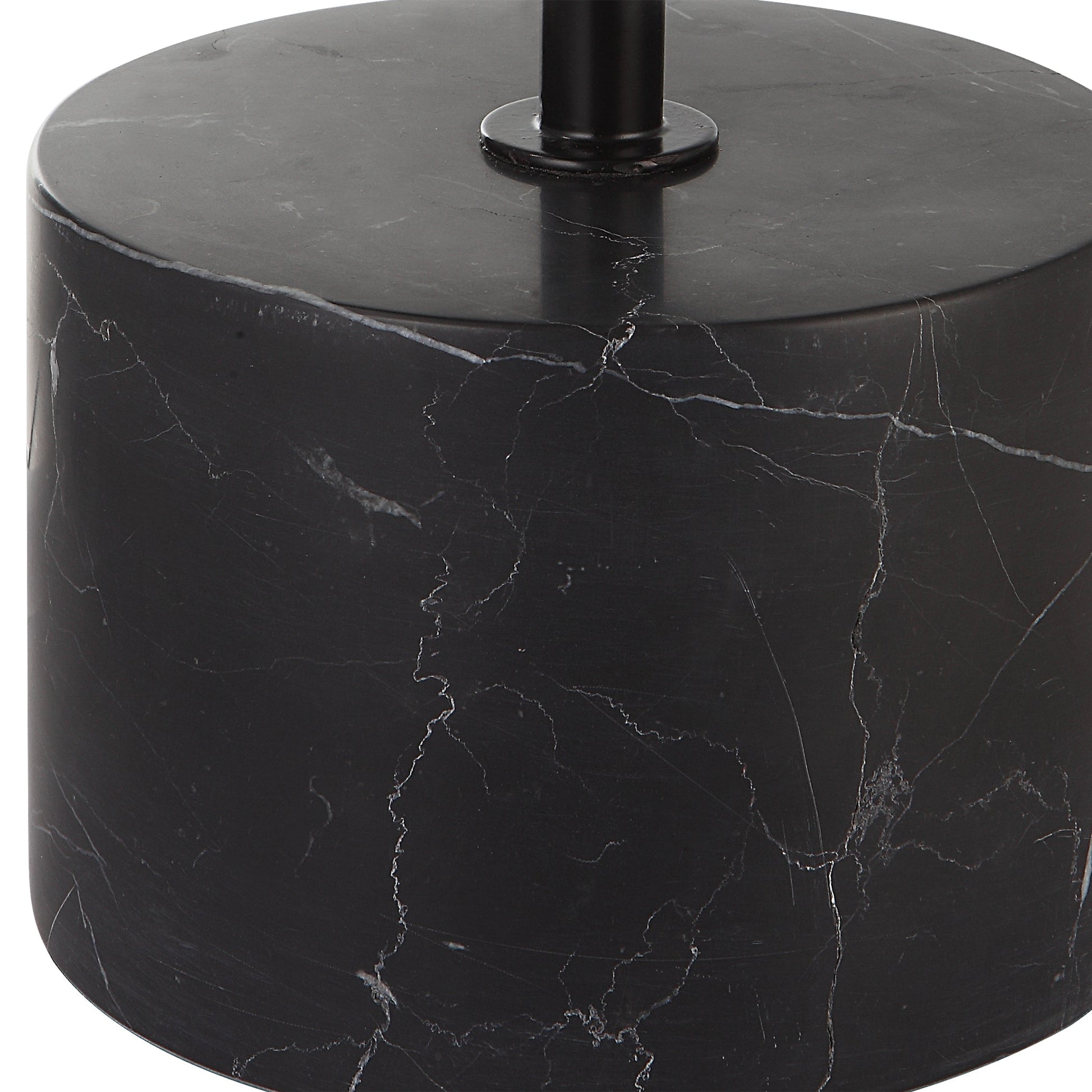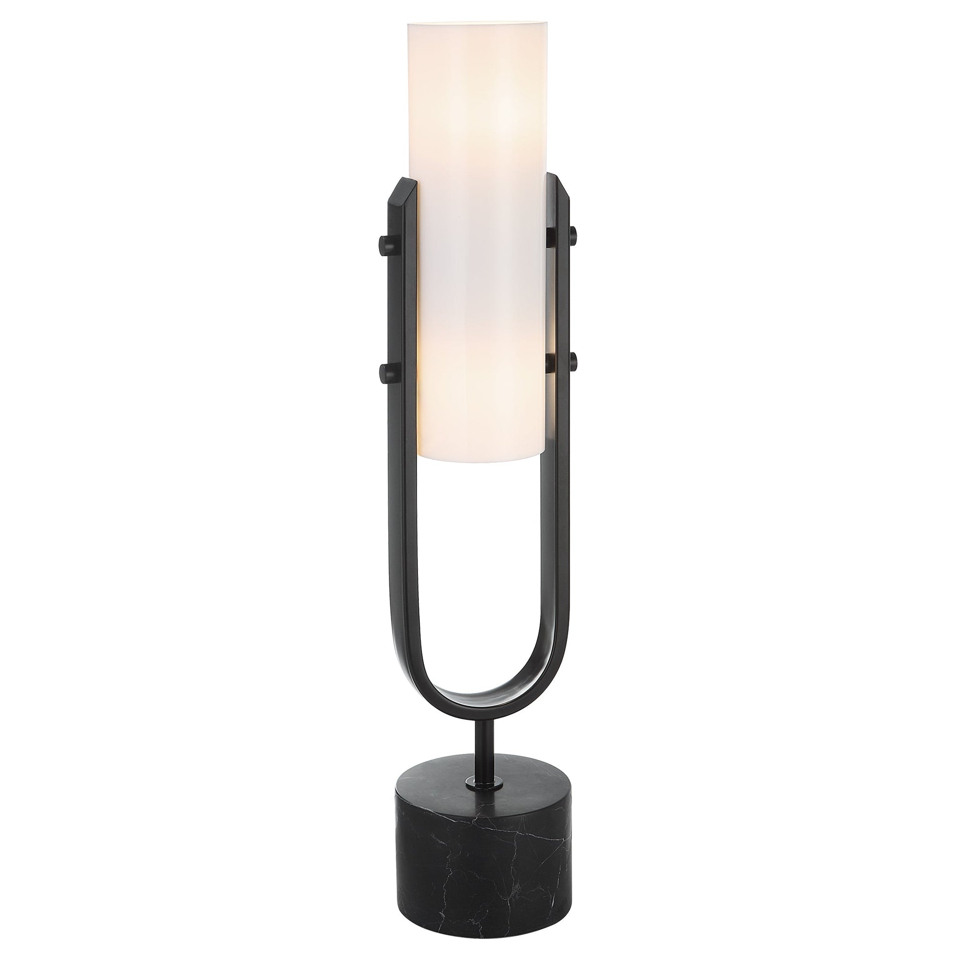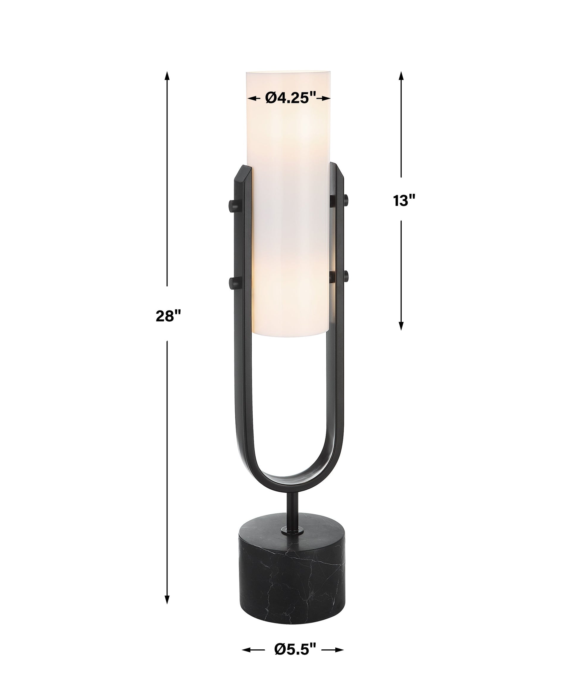 Equal Parts Stylish And Functional, This Tabletop Accent Features A Sleek Black And White Design With A Solid Marble Foot, Steel Body And White Acrylic Shade. Overall Depth : 5.5 in Overall Width : 5.5 in Overall Height : 28 in
