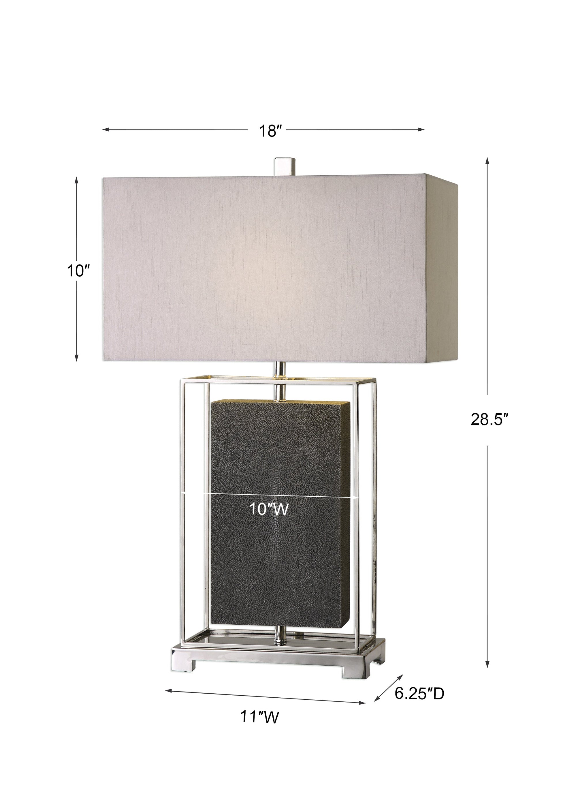 The Suspended Rectangle Base Features A Rubbed Gray Faux Shagreen Texture, Surrounded By Polished Nickel Plated Details. The Rectangle Hardback Shade Is A Warm Light Gray Linen Fabric. Overall Depth : 10 in Overall Width : 18 in Overall Height : 28.5 in