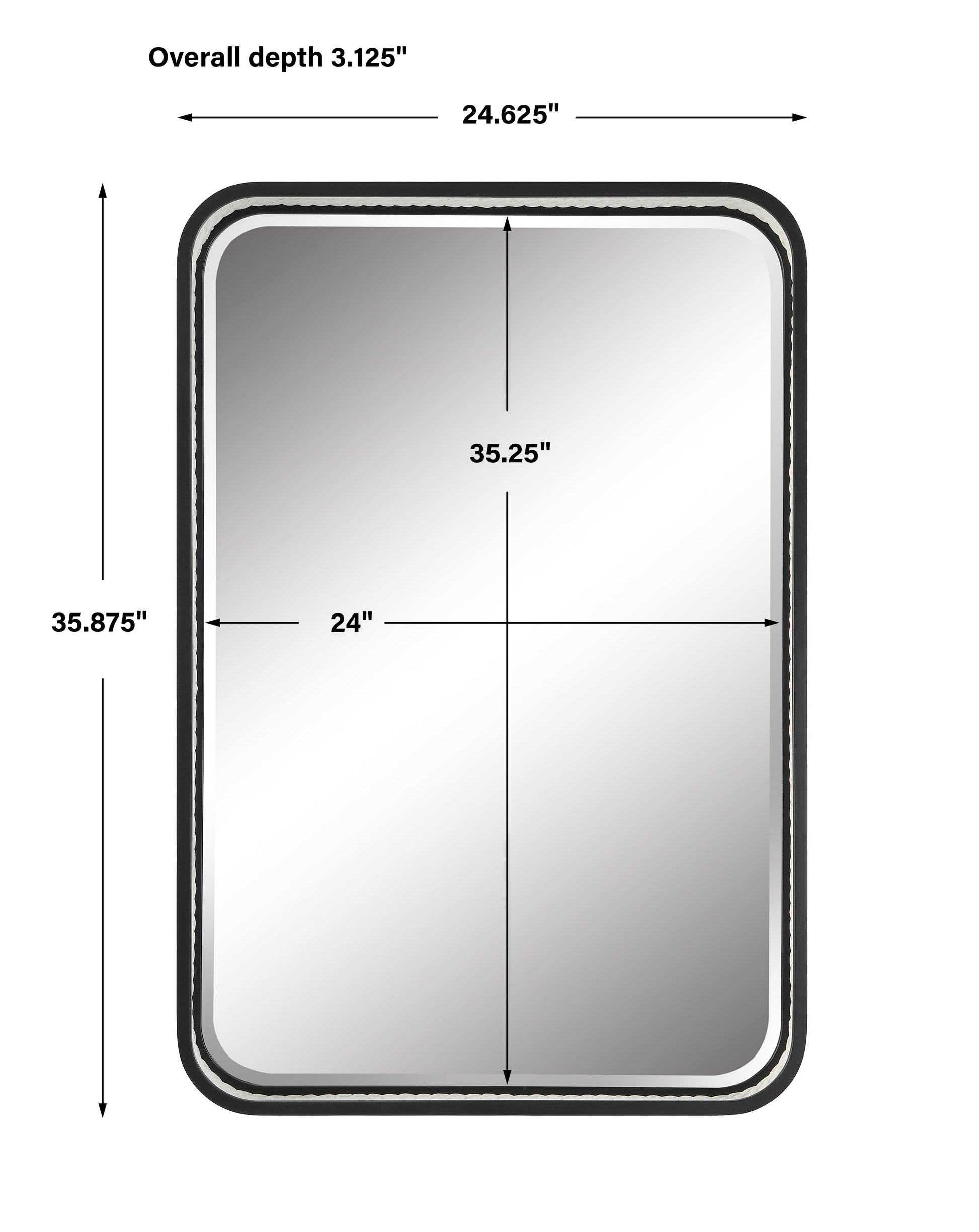 This Modern Design Features A Deep Profile Iron Frame Finished In Satin Black Paired With Braided White Rope Lining The Inner Frame. Mirror Features A Generous 1 1/4" Bevel. May Be Hung Horizontal Or Vertical. Overall Depth : 3.125 in Overall Width : 24.625 in Overall Height : 35.875 in