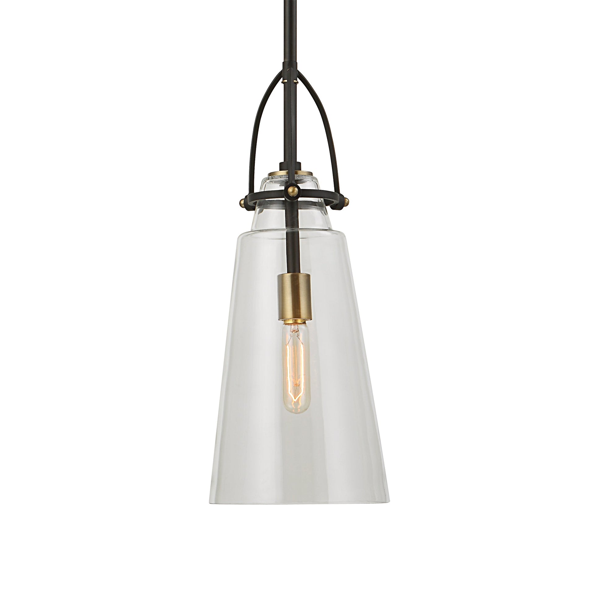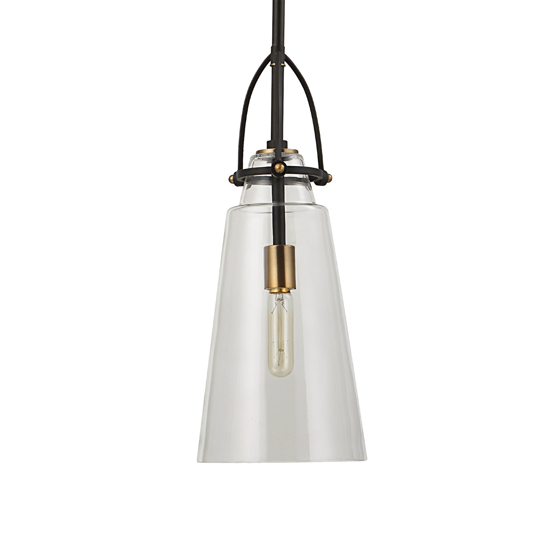 This Timeless 1 Lt. Mini Pendant Is Finished In Black With Antique Brass Accents Featuring Clear Glass And A Touch Of Rustic & Industrial Design. 1-60 Watt Max, Edison Socket. Bulb Not Included. Supplied With 15' Wire, And 3-12" Stems & 1-6" Stem For Adjustable Installation. Overall Depth : 8 in Overall Width : 8 in Overall Height : 20 in