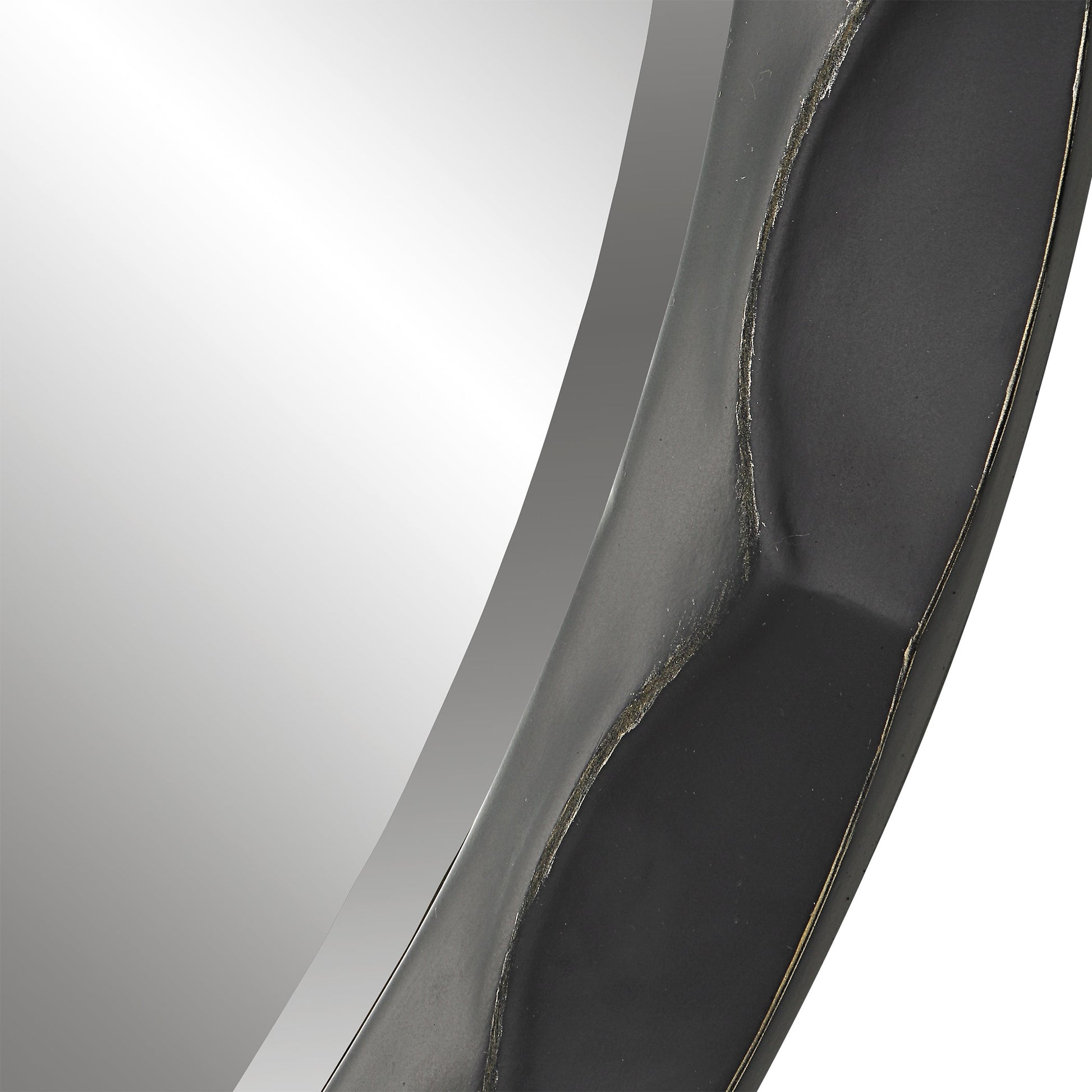 This Round Mirror Showcases A Molded Frame With A Unique Scalloped Motif Finished In A Lightly Rubbed Aged Black With Subtle Silver Undertones. Mirror Has A 1 1/4" Bevel. Overall Depth : 0.88 in Overall Width : 38 in Overall Height : 38 in
