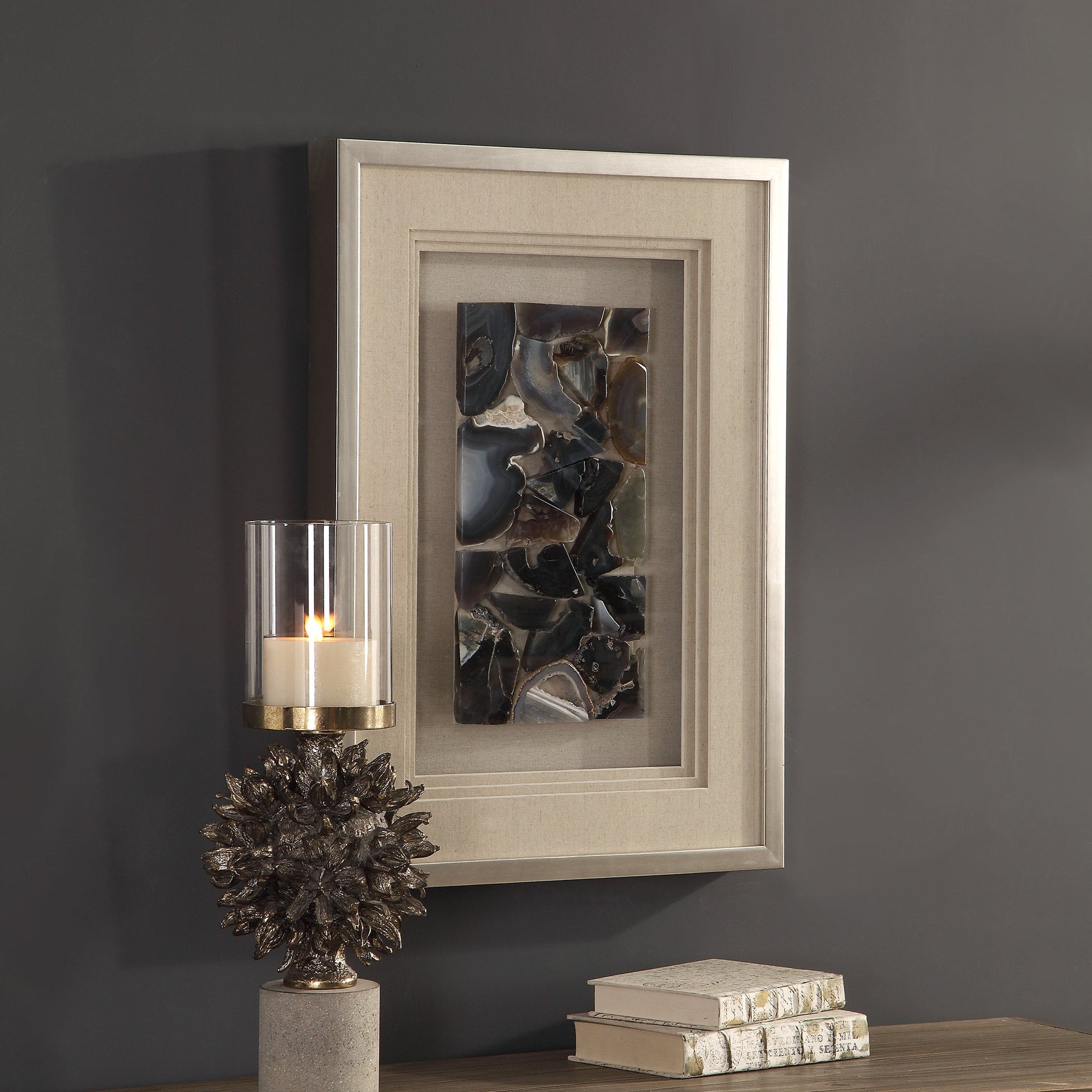 A Collection Of Natural Agate Stones In Tones Of Cool Blues And Tans, Set Under Multi-layered Matting In Flecked Oatmeal Linen And Encased In A Brushed Silver Pine Shadow Box. Each Piece Will Vary Slightly. Overall Depth : 2.375 in Overall Width : 19.625 in Overall Height : 27.5 in