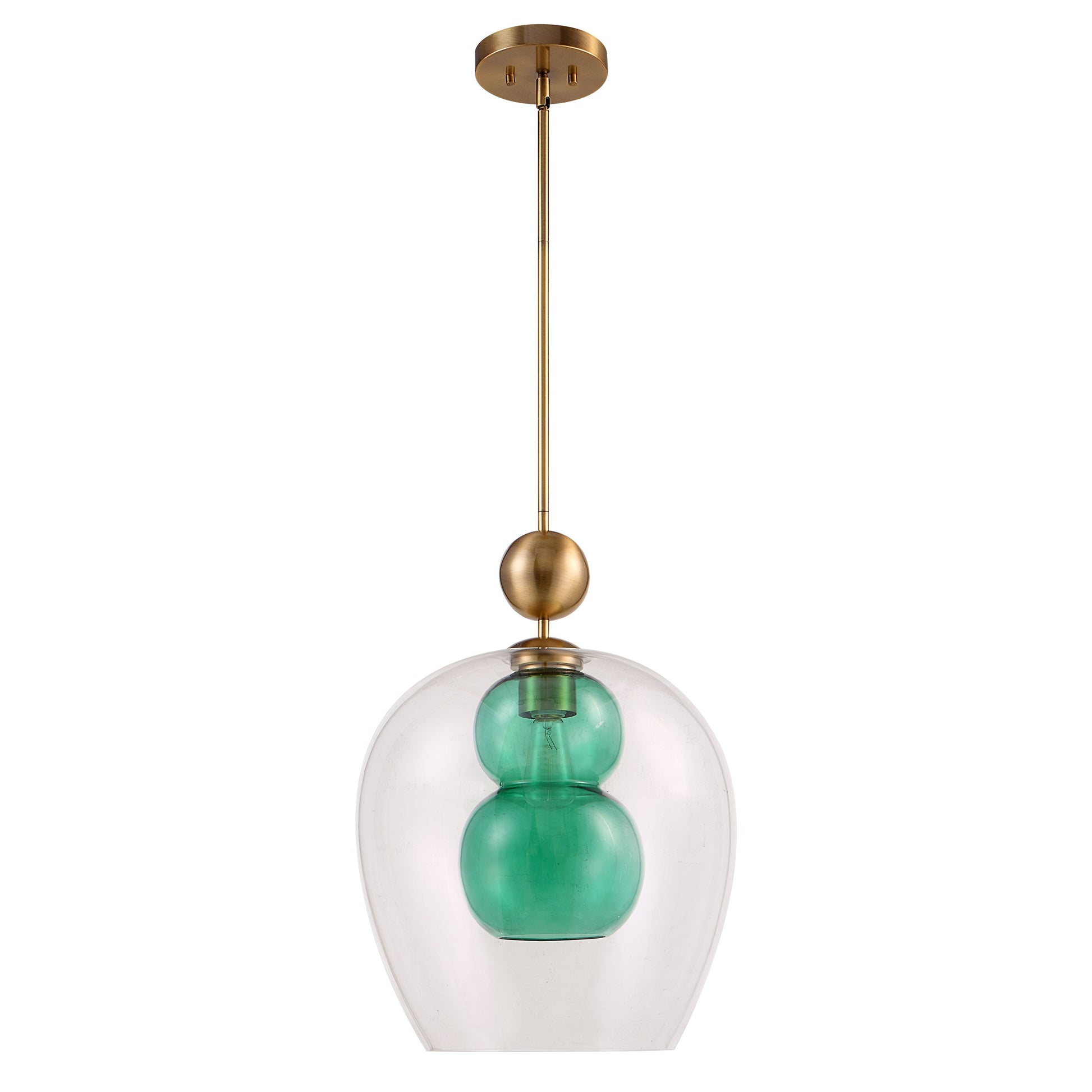 Vibrant Green Stacked Sphere Glass Is The Focal Point Inside A Chic Oversized Clear Outer Glass, Giving Us This Dramatic 1 Lt. Pendant. The Warm Oxidized Antique Brass Finish Adds To The Rich Opulent Look. 1-100 Watt Max, Edison Socket. Supplied With 15' Wire, 3-12" Stems And 1-6" Stem For Adjustable Installation. Overall Depth : 15.75 in Overall Width : 15.75 in Overall Height : 21.5 in
