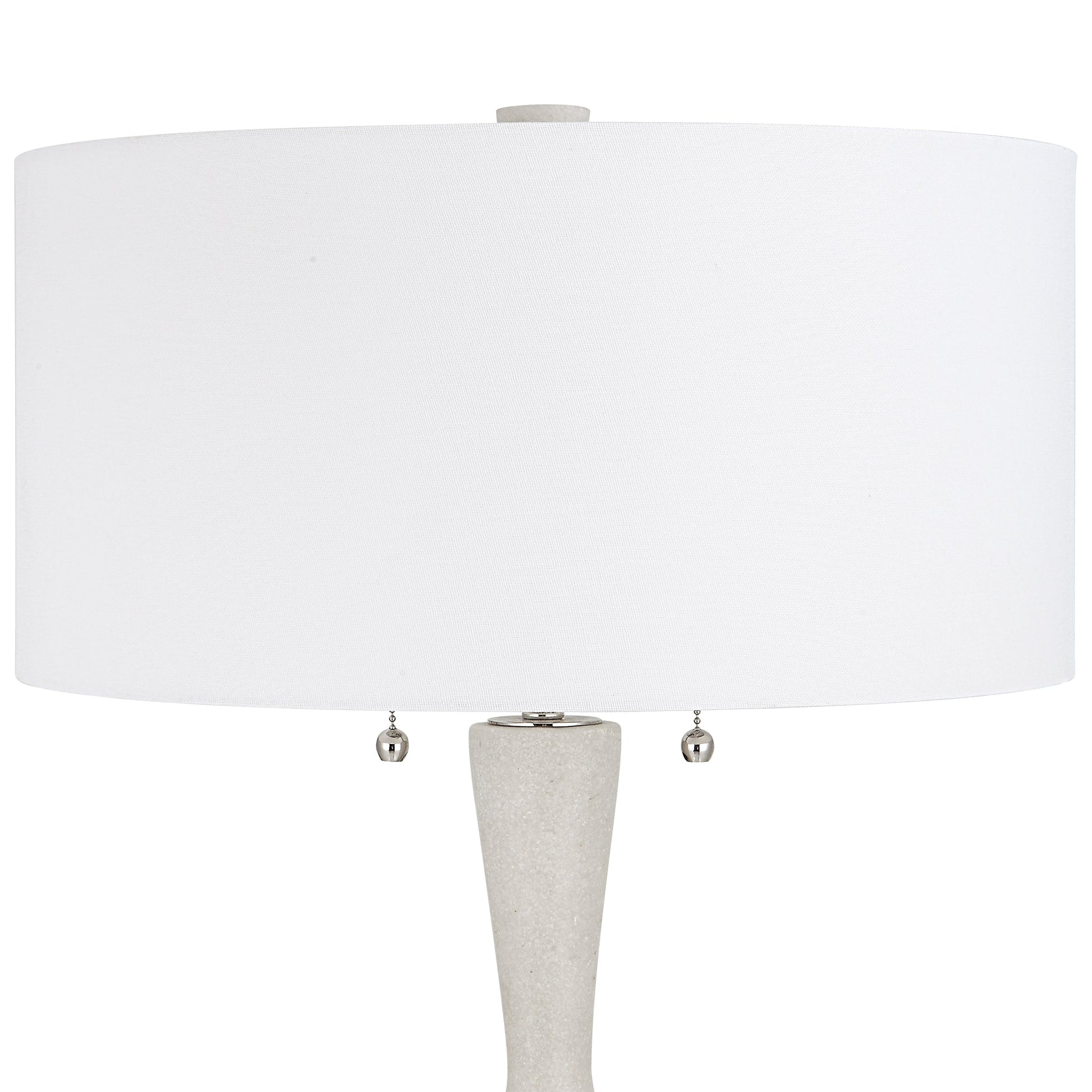 This Table Lamp Showcases An Eloquent Silhouette That's Crafted From Ivory Man-made Stone That Accurately Replicates The Look Of Thassos Marble, Accented With Iron Details Finished In Polished Nickel. The Round Hardback Shade Is Covered In White Linen Fabric. Overall Depth : 18 in Overall Width : 18 in Overall Height : 38.5 in