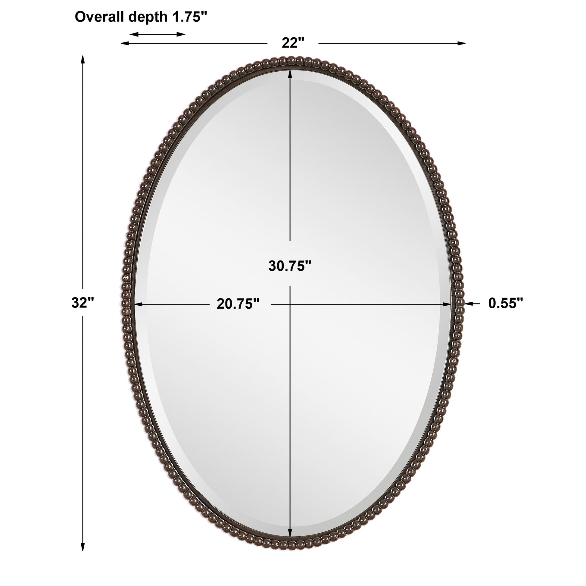 This Oval Mirror Features A Beaded Frame Made Of Hand Forged Metal Finished In Lightly Distressed, Oil Rubbed Bronze. Mirror Is Beveled. Overall Depth : 1.75 in Overall Width : 22 in Overall Height : 32 in