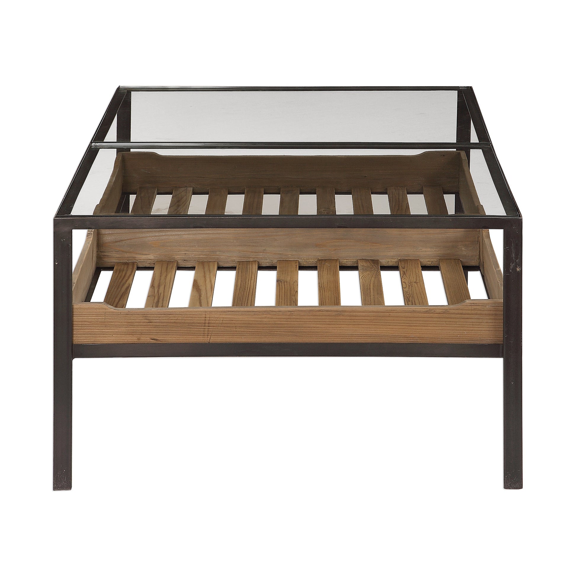 A Versatile Look For Any Style Space, This Functional Table Features Two Slide Out Storage Trays Constructed From Solid Reclaimed Pine, Perfect For Storing Books Or Other Decorative Memorabilia. Iron Frame Is Finished In An Aged Steel With Two Drop-in Tempered Glass Tops. Solid Wood Will Continue To Move With Temperature And Humidity Changes, Which Can Result In Small Cracks And Uneven Surfaces, Adding To Its Authenticity And Character. Overall Depth : 30 in Overall Width : 40 in Overall Height : 18 in