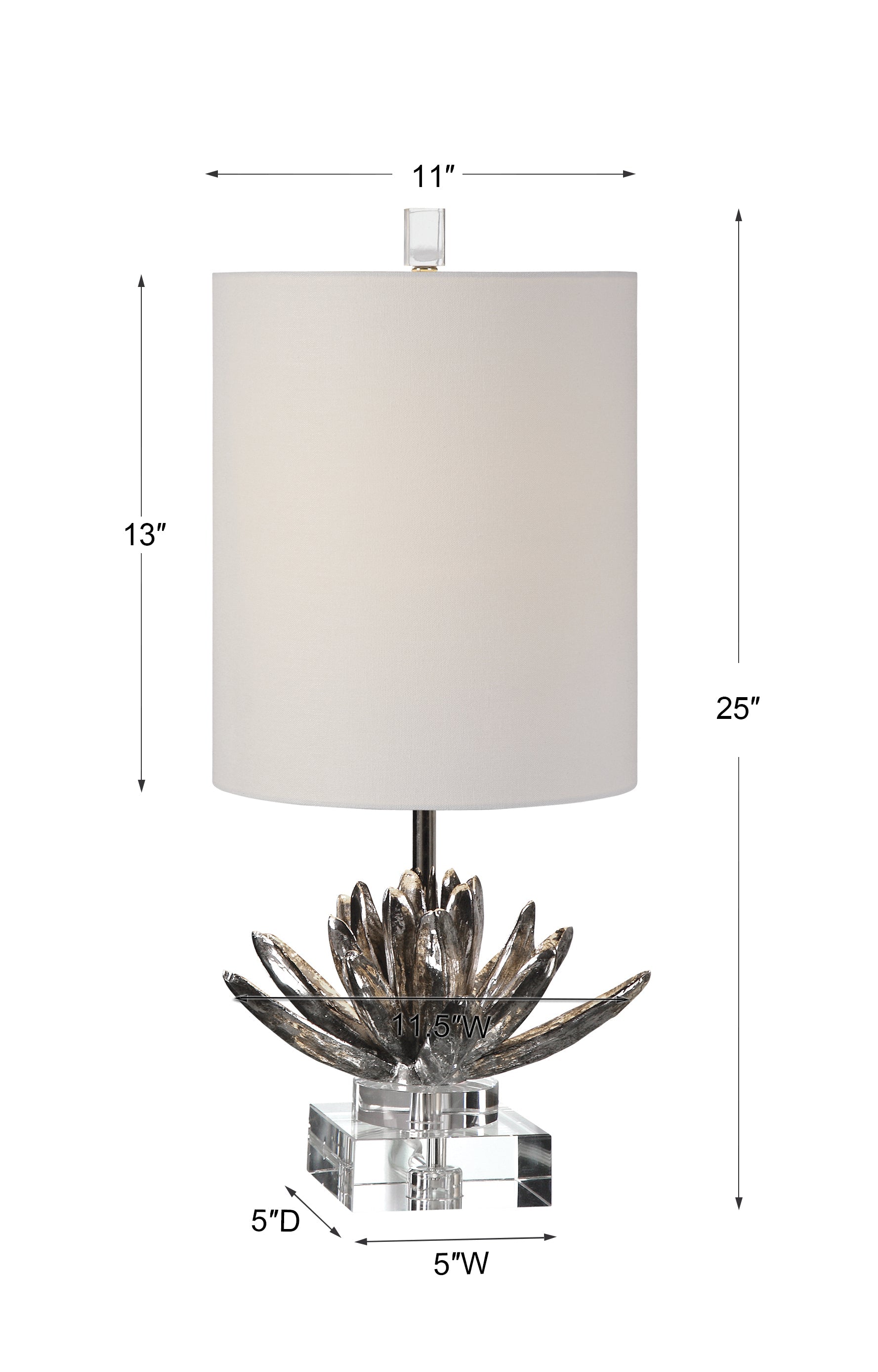 Simple Elegance Is Achieved By This Antiqued, Metallic Silver, Lotus Bloom That Appears To Be Floating On A Clear Crystal Foot. The Round Hardback Drum Shade Is A White Linen Fabric With Natural Slubbing. Overall Depth : 11 in Overall Width : 11 in Overall Height : 25 in