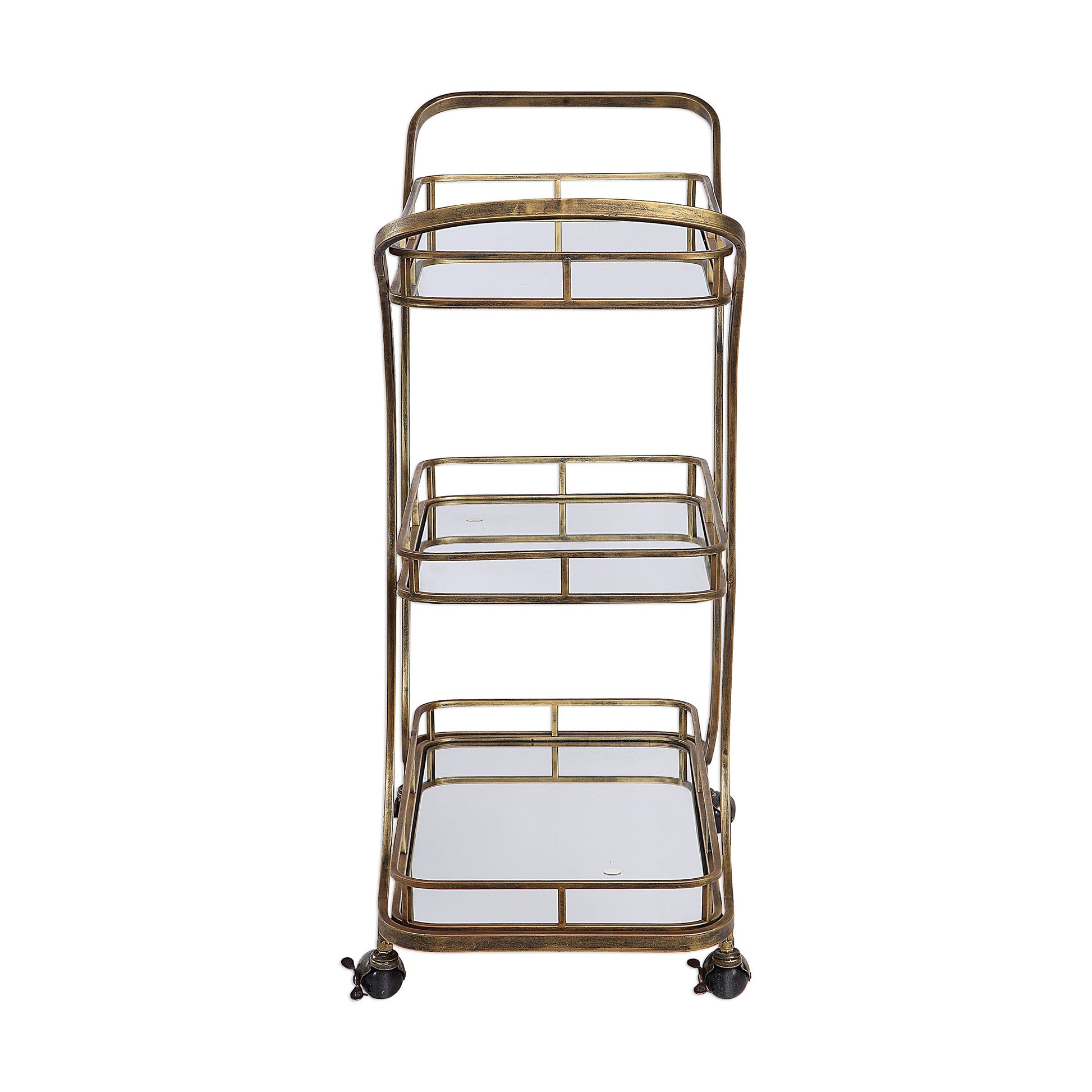 Hand Forged In Solid Iron, This Transitional Bar Cart Features Three Tray Style Mirrored Shelves Finished In Antiqued Gold, Complete With Rolling Casters. Overall Depth : 15 in Overall Width : 33 in Overall Height : 36.75 in