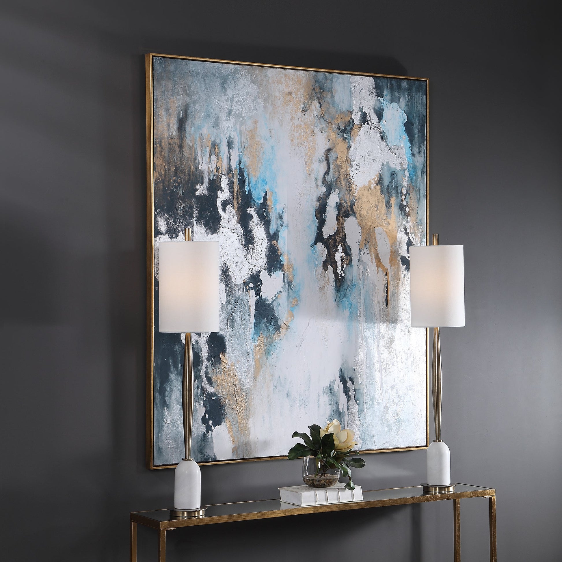 This Hand Painted Canvas Showcases Large Brushstrokes And Heavy Texture. Dark Teal And Light Blue Shades Are Complemented By Gold And Silver Leaf Accents. A Gold Leaf Gallery Frame Surrounds The Abstract Artwork. Due To The Handcrafted Nature Of This Artwork, Each Piece May Have Subtle Differences. This Piece May Be Hung Horizontal Or Vertical. Overall Depth : 1.7 in Overall Width : 51 in Overall Height : 61 in