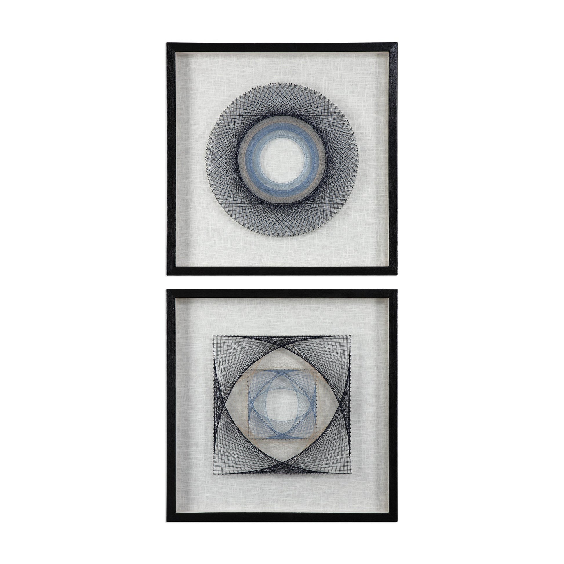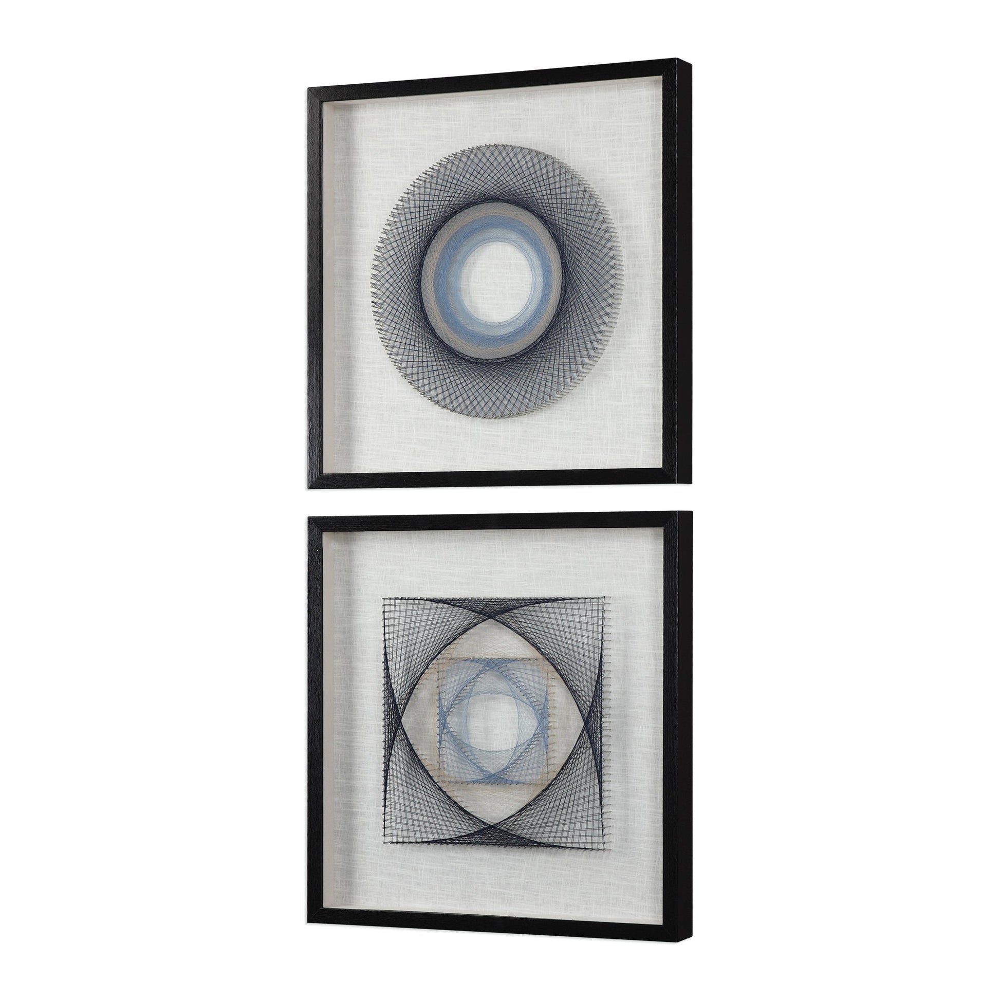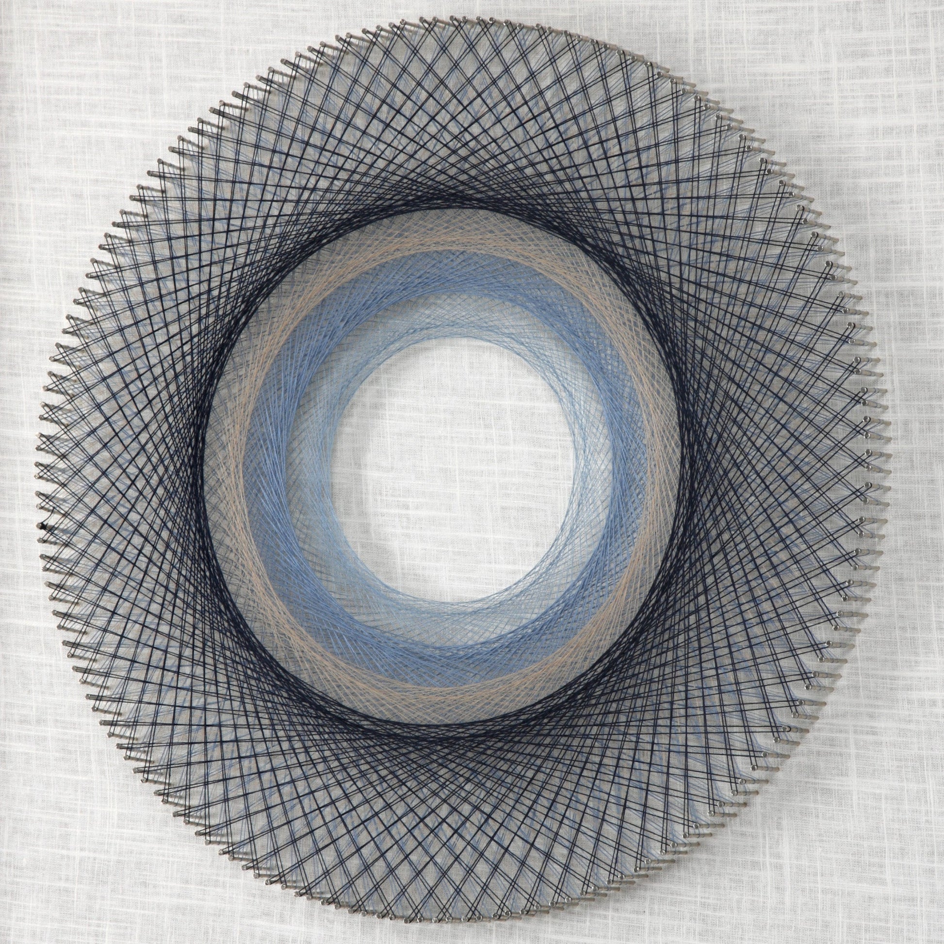 These Fun Shadow Boxes Feature 3-dimensional Layered String Art, Hand Threaded Around Individually Hammered Pin Nails In Easy Shades Of Blue, Over A Neutral Linen Backing With A Black Pine Frame. Overall Depth : 2.5 in Overall Width : 23.625 in Overall Height : 23.625 in