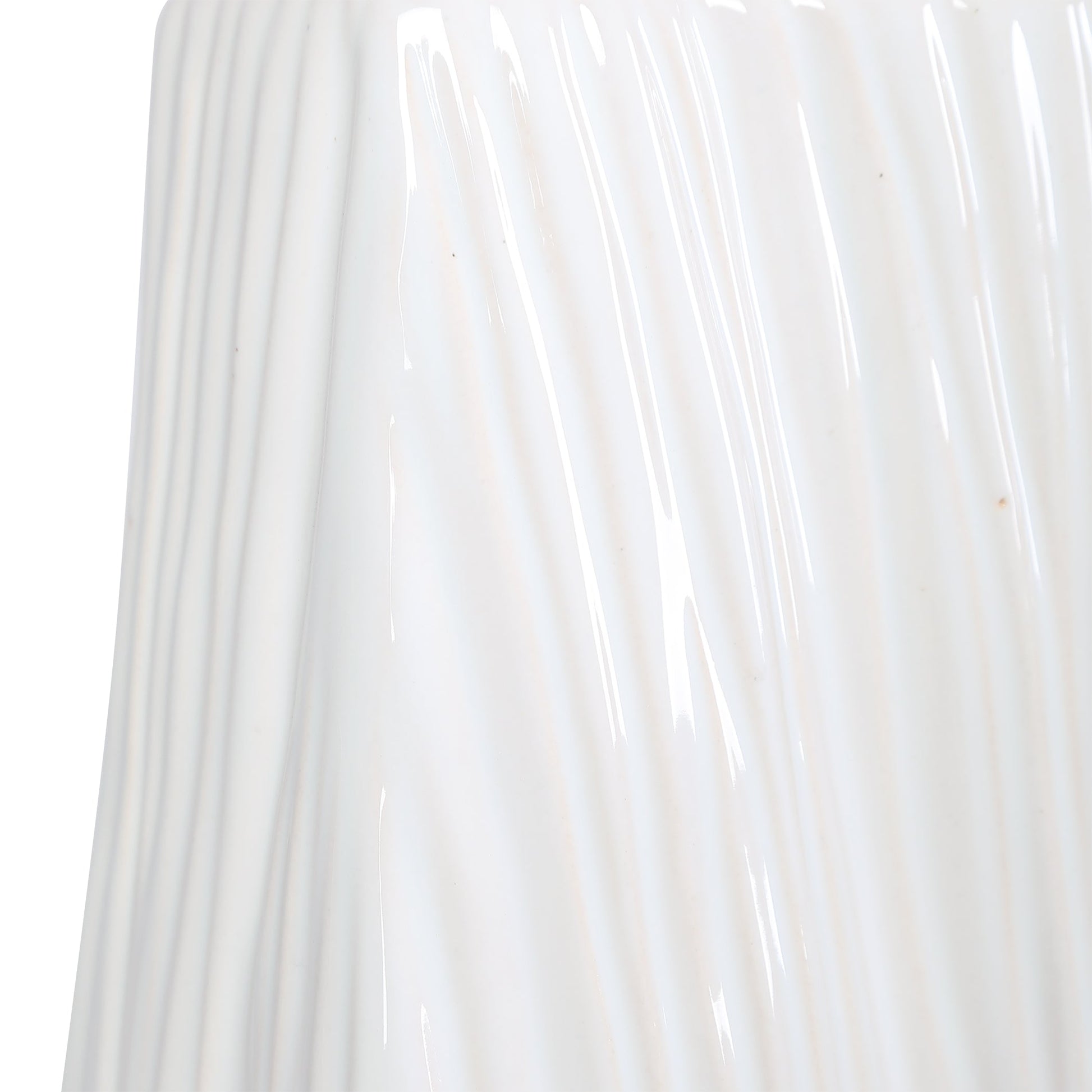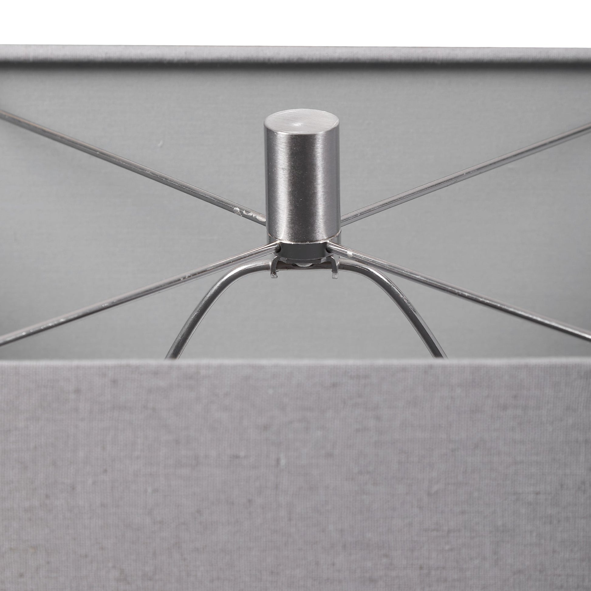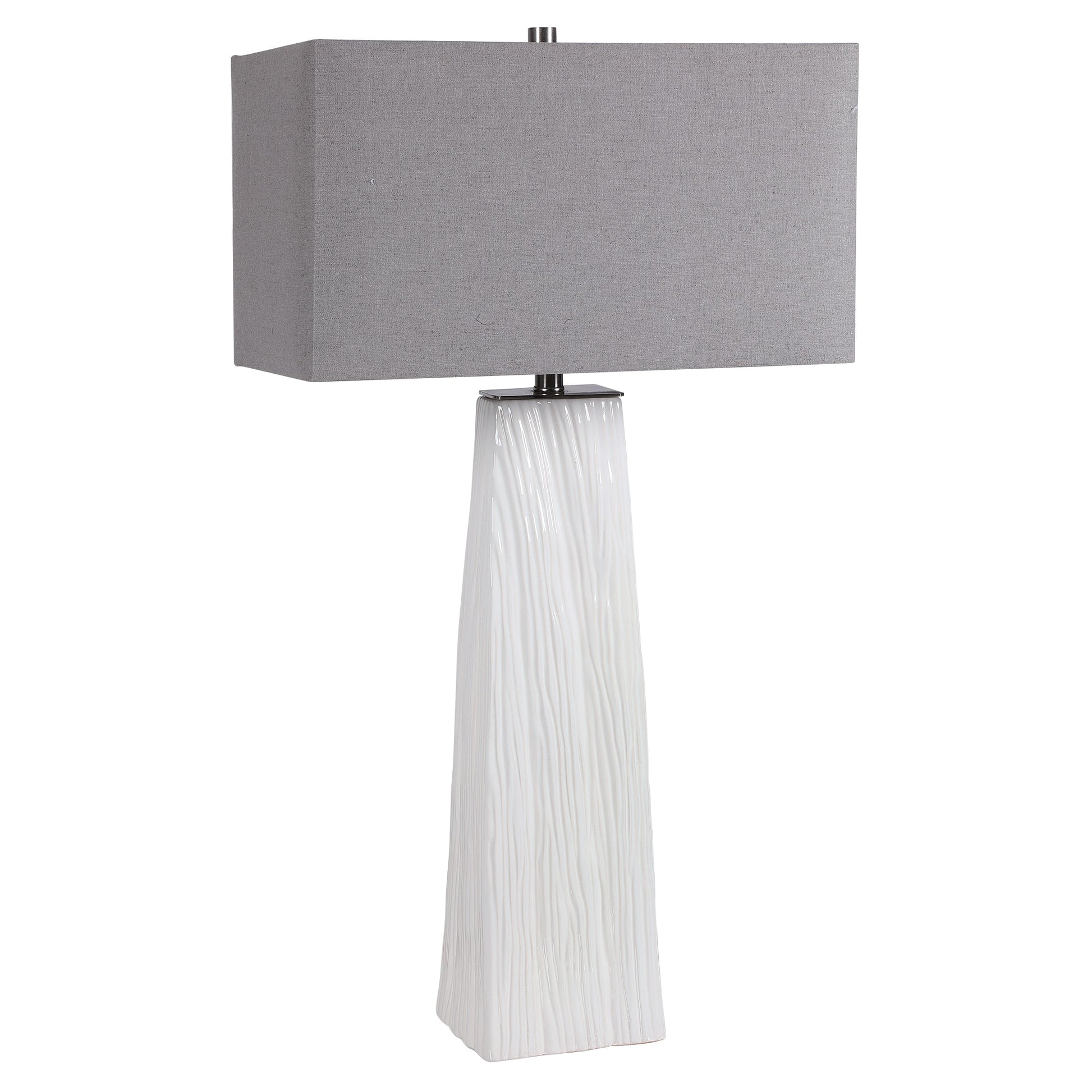 Elegant And Versatile, This Table Lamp Features A Gloss White Ceramic Base Featuring Organic Hand Carved Details And Brushed Nickel Accents. The Piece Is Paired With A Rectangle Hardback Shade In Gray Linen Fabric With Natural Slubbing. Overall Depth : 11 in Overall Width : 19 in Overall Height : 36 in