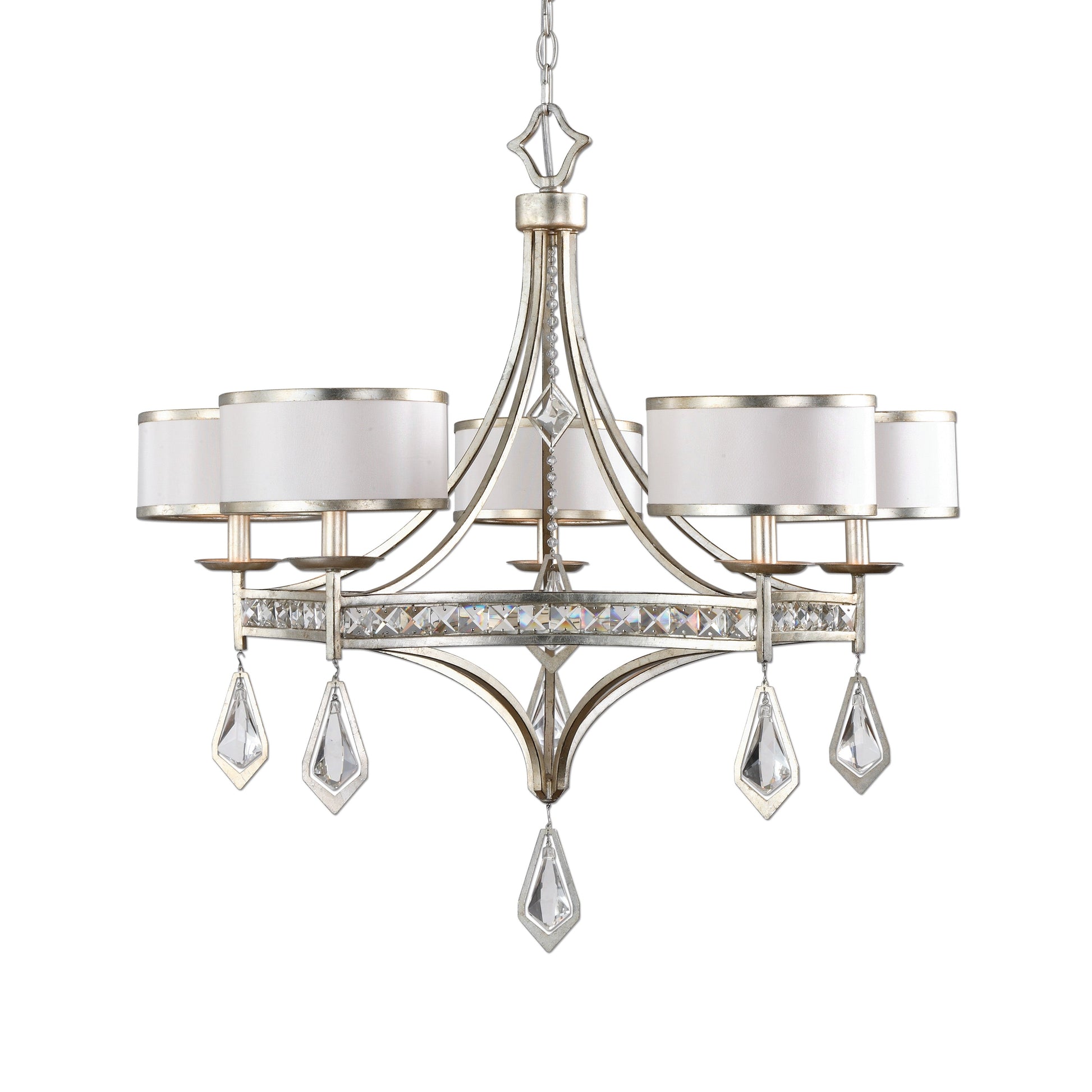 Burnished Silver Champagne Leaf Finish With Modern Clear Crystal Accents Highlight This Majestic Chandelier Along With Silken Off-white Hardback Shades. 5-60 Watt Max, Candelabra Sockets. Bulbs Not Included. Supplied With 20' Wire And 7' Chain For Adjustable Installation. Overall Depth : 33.875 in Overall Width : 33.875 in Overall Height : 33.875 in