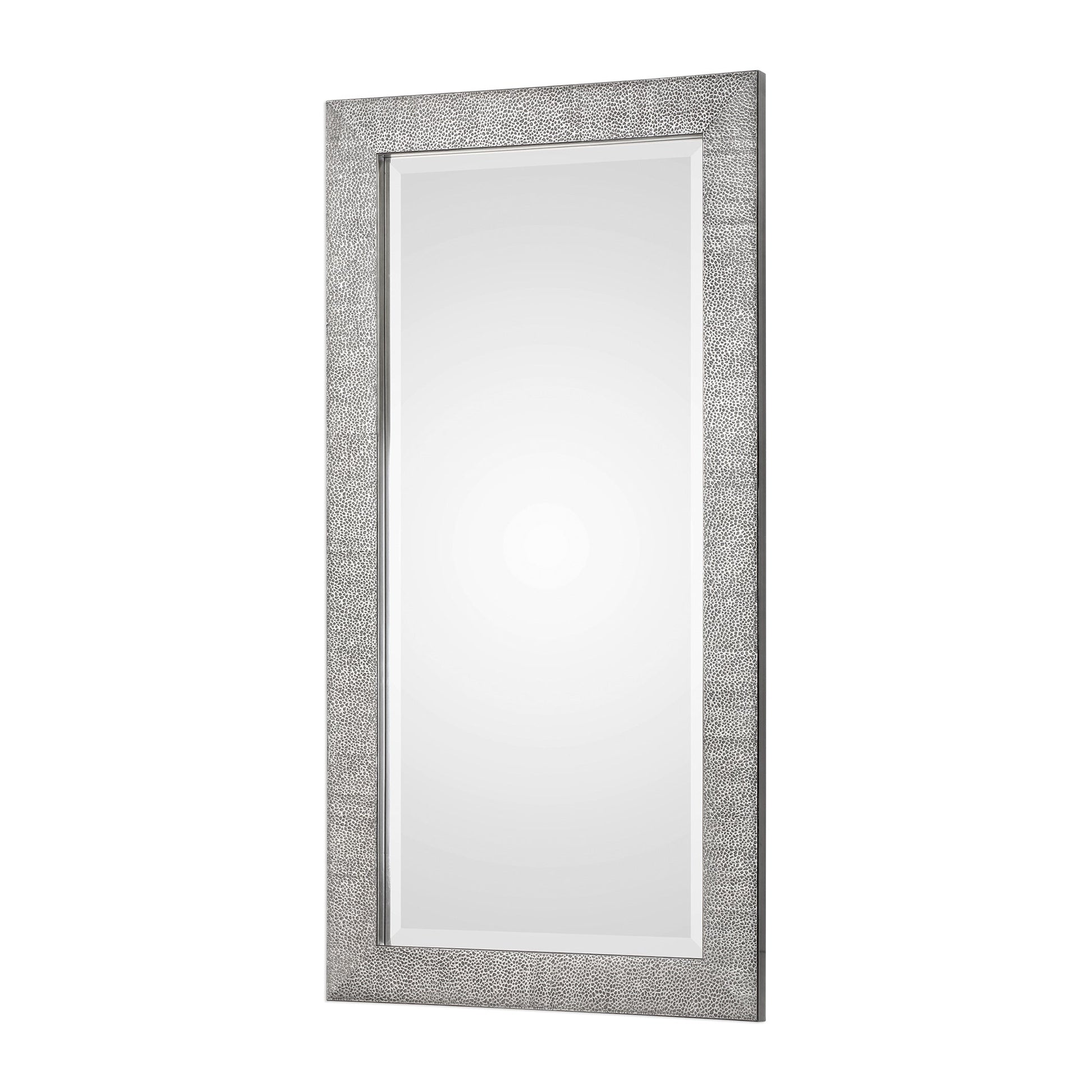 This Contemporary Design Features A Textured Solid Wood Frame Finished In A Metallic Silver With A Light Gray Wash. Mirror Features A Generous 1 1/4" Bevel And May Be Hung Horizontal Or Vertical. Overall Depth : 1 in Overall Width : 24 in Overall Height : 48 in